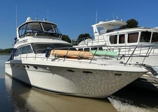 riggers, crab pullers and all sorts of fishing equipment. This lower cockpit area is also ideal for other leisure activities. Facing forward there is a console that has a refrigerated compartment, storage drawers, a sink and a barbecue which are all neatly concealed under contoured fibreglass lids. This is a great space for entertainment and even dancing to the music coming from speakers along the gunwales. The close proximity to the water and access to the swim platform through the transom door connects this area to the sea. The lower cockpit is equally suited whether entertaining, fishing, or just enjoying the breeze, adding versatility to this venerable cruiser. A tender can be placed on the swim platform on an