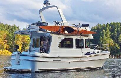 The 590 is designed to cruise at nine or 10 knots. It is powered by twin 405 Cummins diesels with a top speed of close to 12 knots, though larger twins and single engine options are available. The solid glass hull is reinforced with a full keel and skegs in front of the rudders, providing additional protection. Decks are cored with closed-cell foam reinforced with rigid PVC for strength and durability.