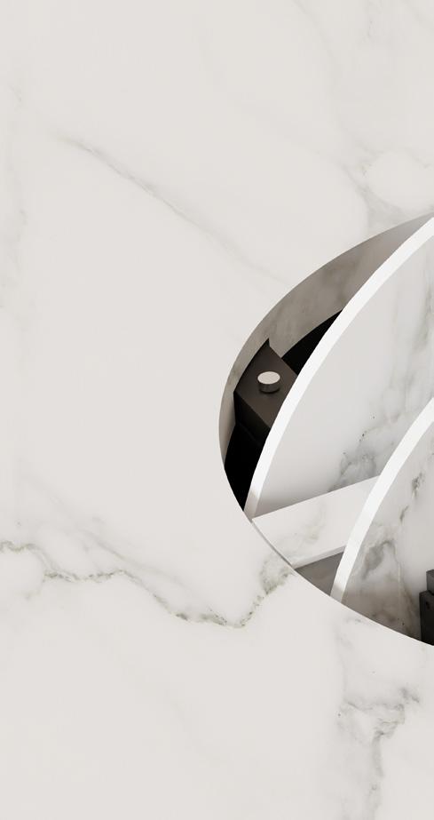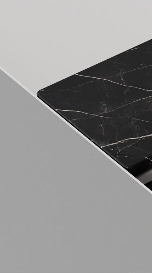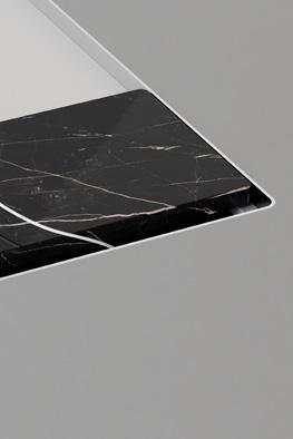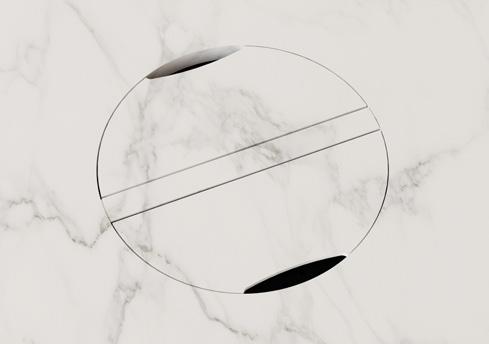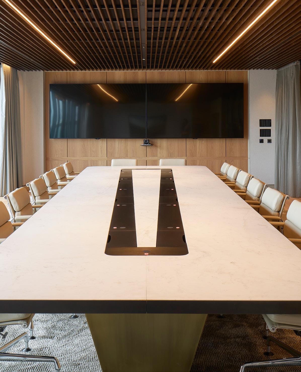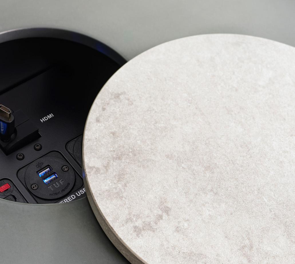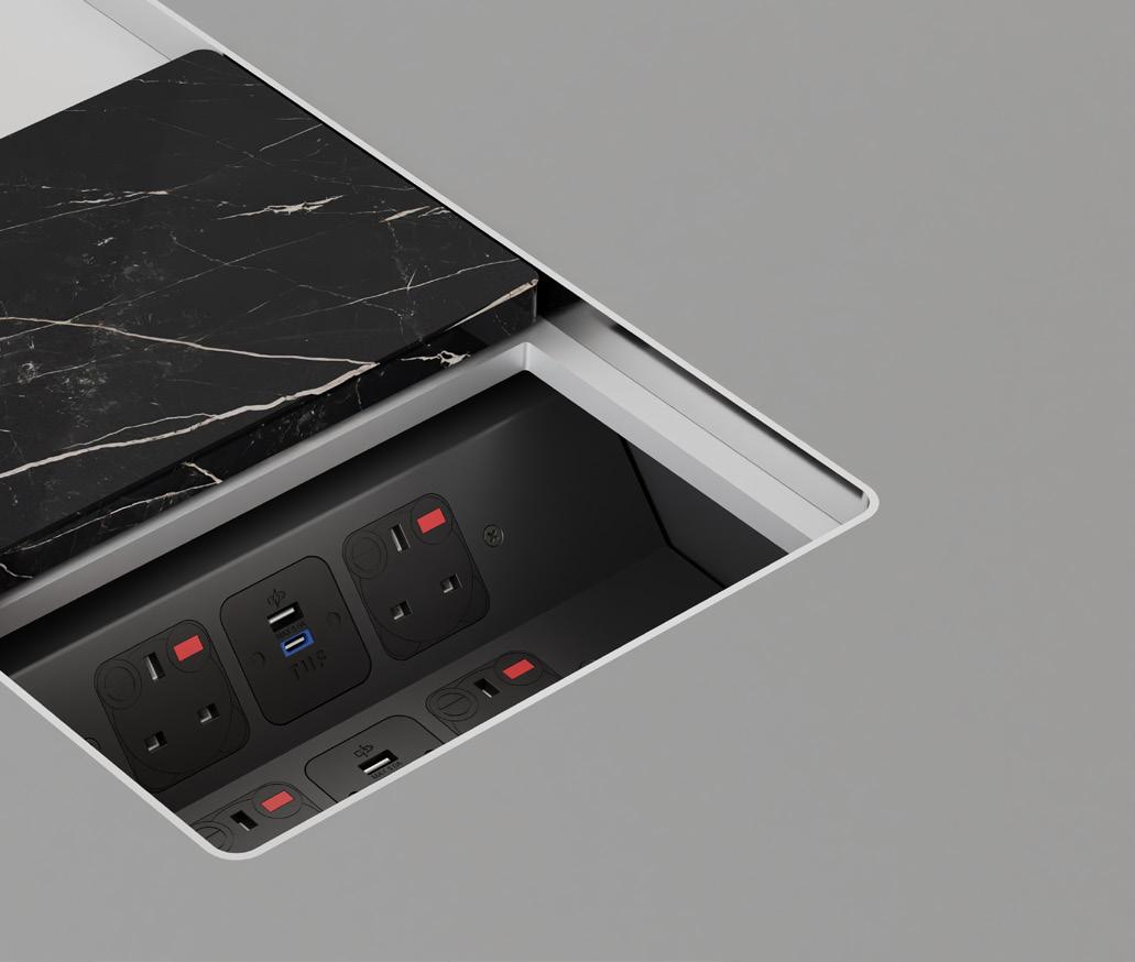 The signature stone detail glides smoothly across its sunken tray to reveal and conceal the connectivity outlets below. It’s an elegant solution that adds a visual statement to the workspace.