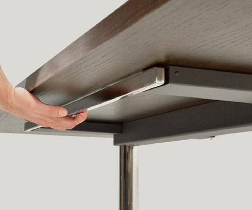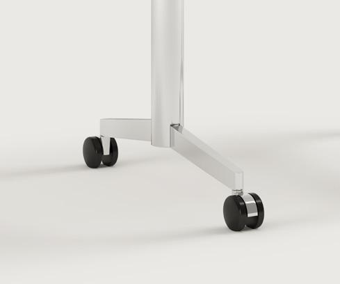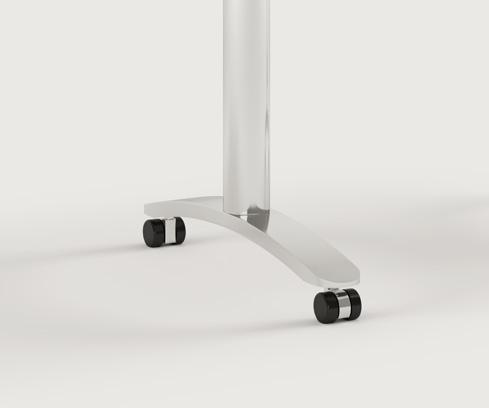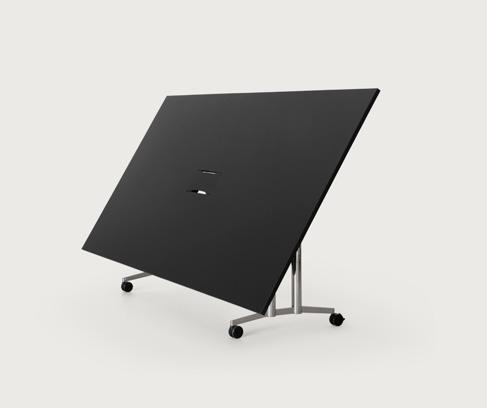 Its ergonomic design allows pieces to seamlessly transition from horizontal to vertical with a single hand movement, via the release of the polished stainless-steel bar beneath the table edge. The controlled hinge mechanism is engineered to support the table top as it rotates; the bases can then be swiftly stacked in storage areas when not in use.