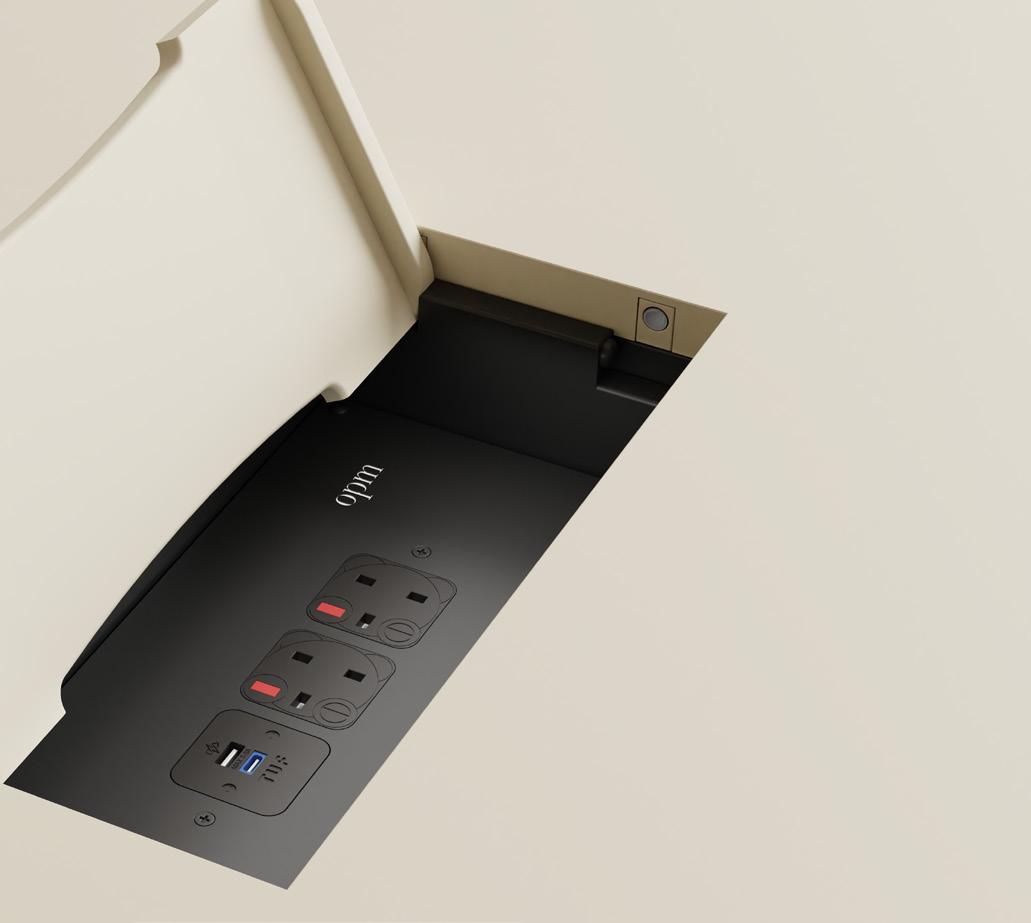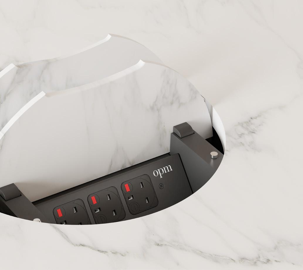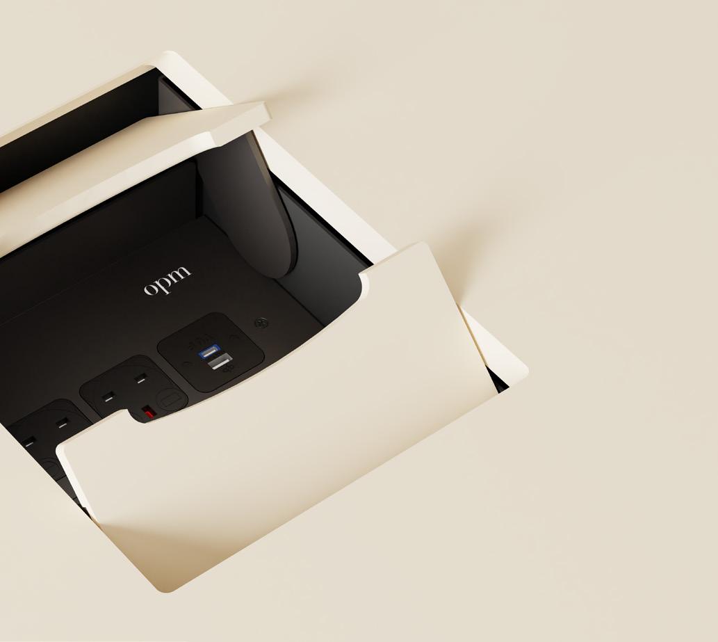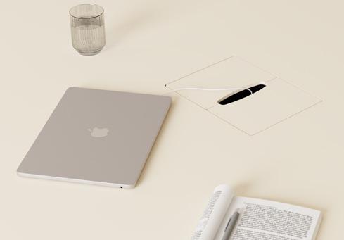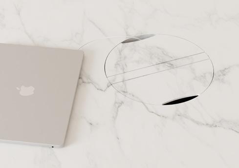 It sits flush with the table surface and has a softly curved opening for cables to pass through when closed, helping you to maintain a seamless and tidy work surface.