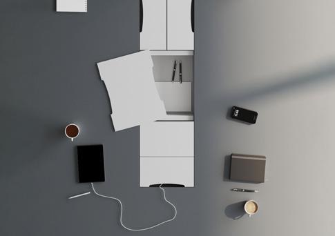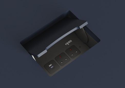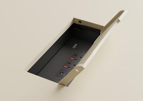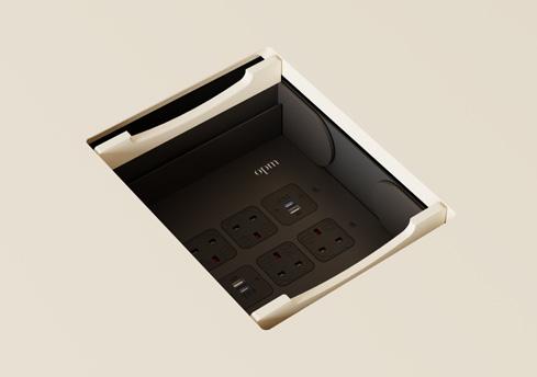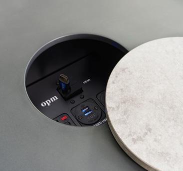 The smooth open and close action is activated by a gentle touch, with the pod secured magnetically when closed. These curved components fit perfectly within D-ended rectangular tables, as well as in circular tables, where they sit back to back for 360-degree access to connectivity.
