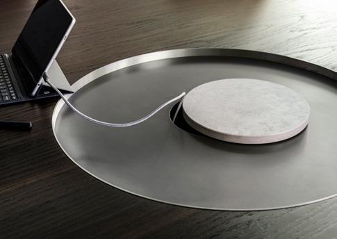 The signature stone disc rotates smoothly around its sunken tray to reveal and conceal the connectivity outlets below. It’s an elegant solution that adds a visual statement to the workspace.