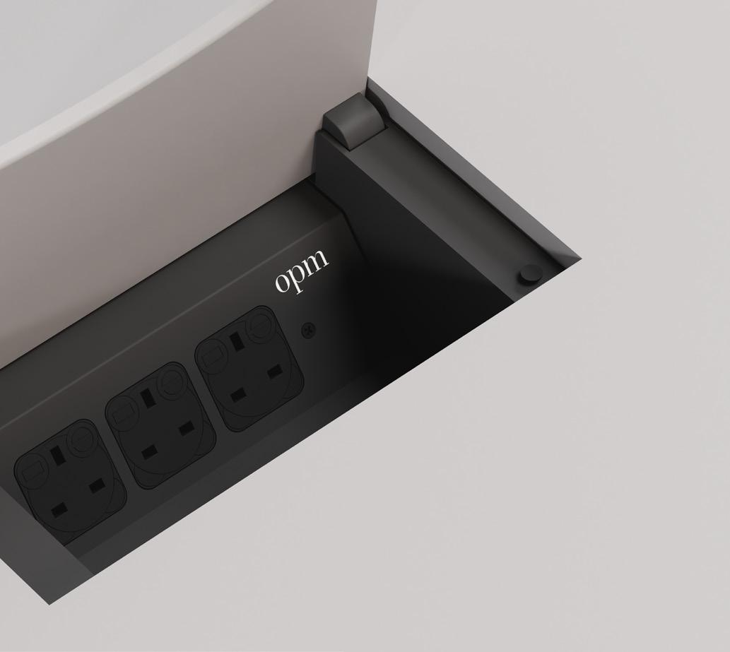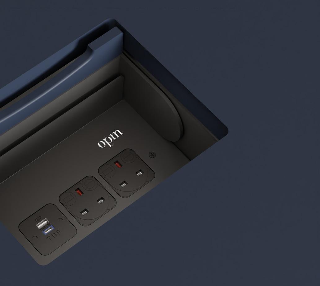All our connectivity pods can be customised with a range of power outlets and materials perfectly tailored to your project. They can be paired with any OPM table base, whose leg columns provide housing to conceal cables as they guide them down to the floor power box, leaving you with a cable-free workspace.