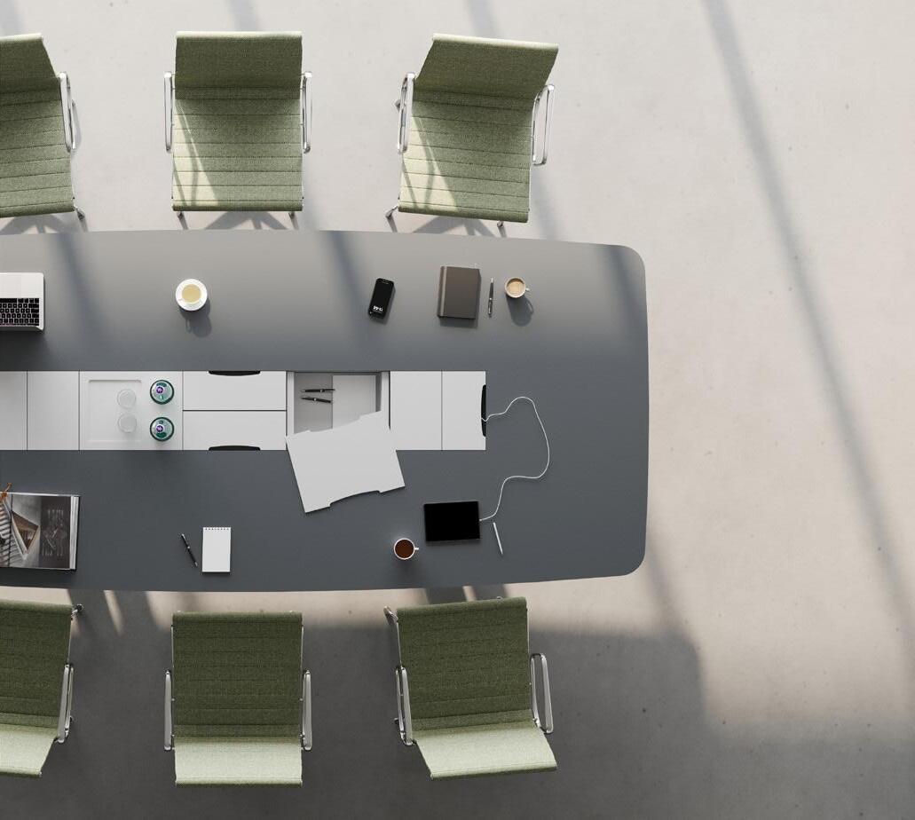 The table bases are available in standard or bespoke sizes, supporting a range of tabletop sizes and shapes, from small meeting to boardroom tables, and have generous housing for AV equipment to help you maintain a cable-free environment.