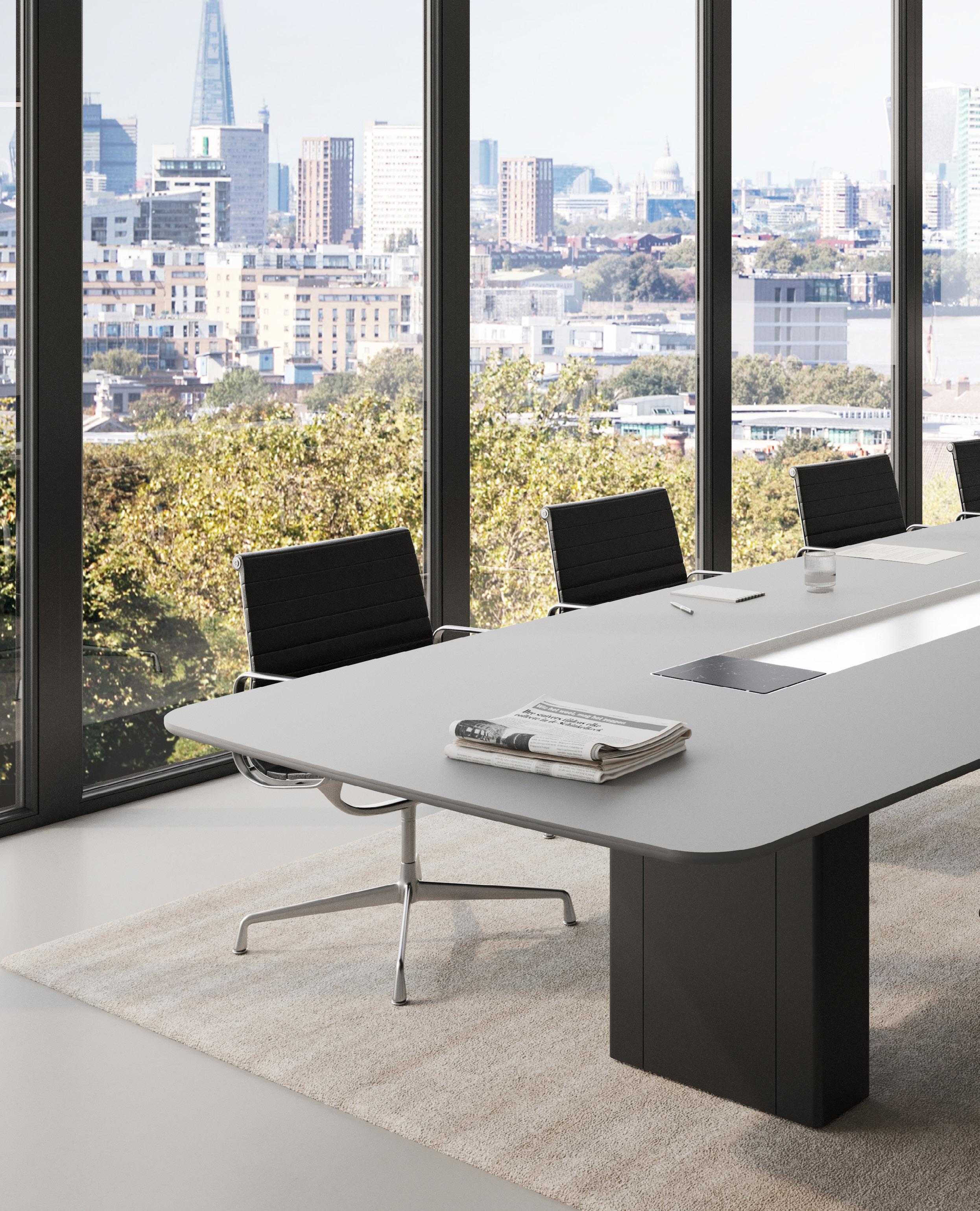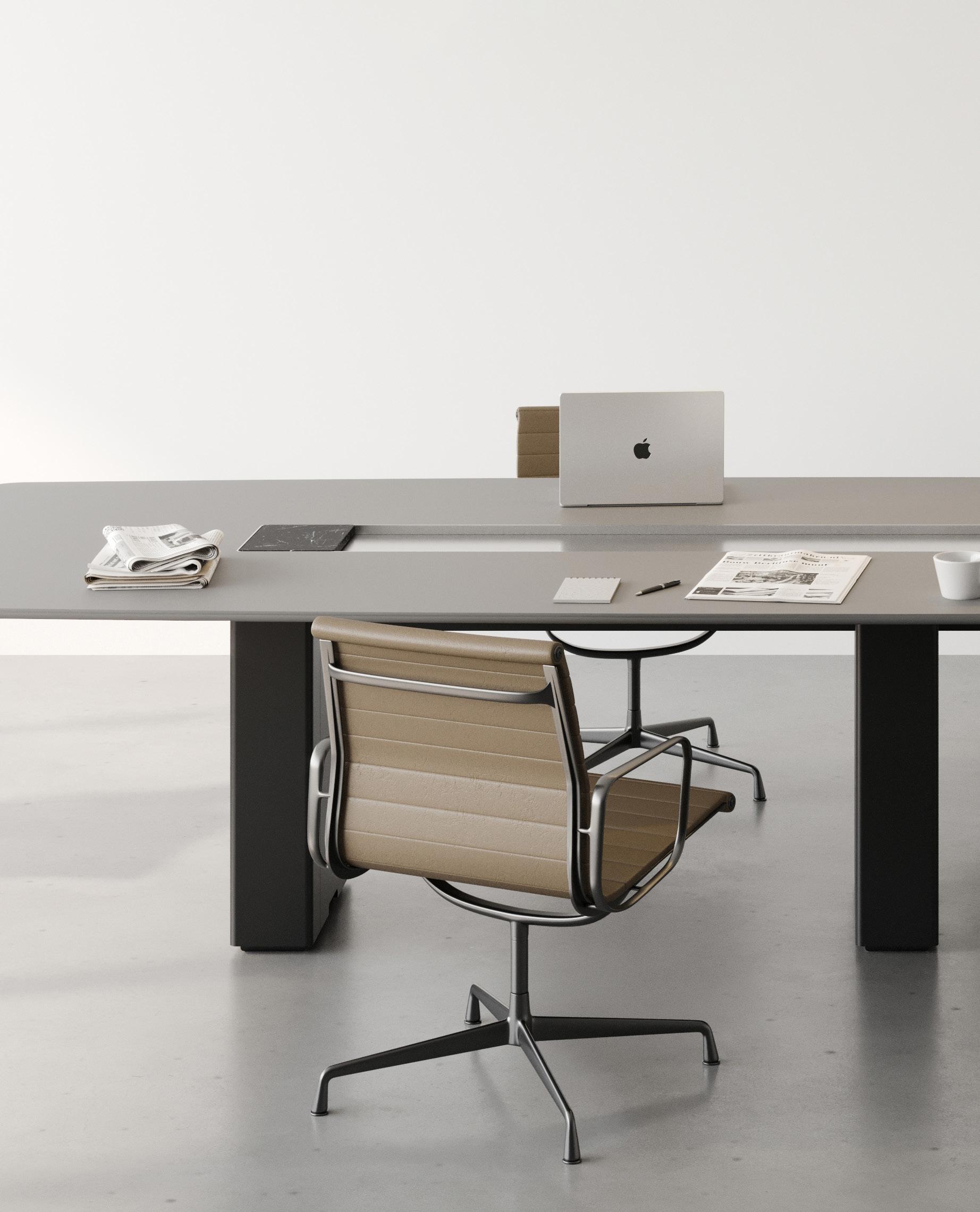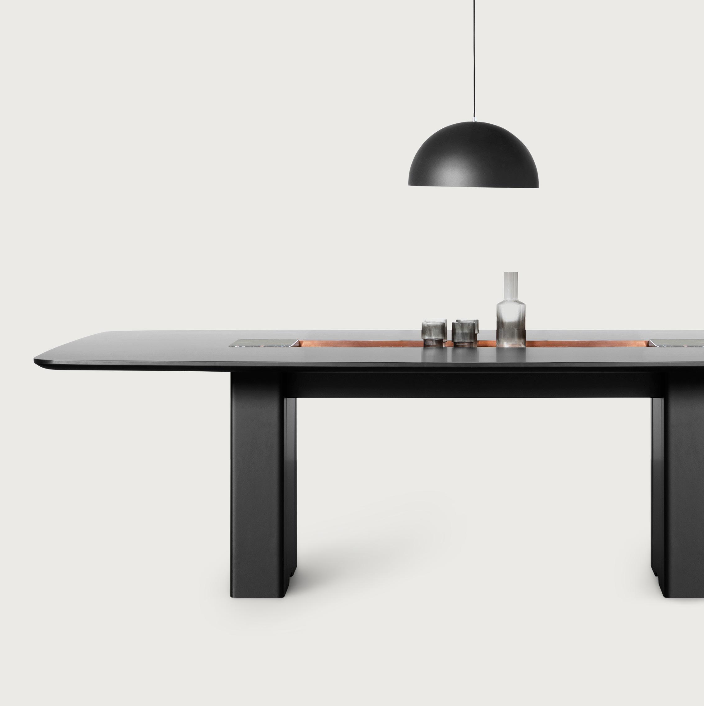 Object rectangular tabletops feature signature stone plates, which glide across a sunken metal tray to reveal & conceal integrated connectivity outlets. These distinctive details create a central focal point within the table for storage and access to power, promoting an organised and collaborative workspace.