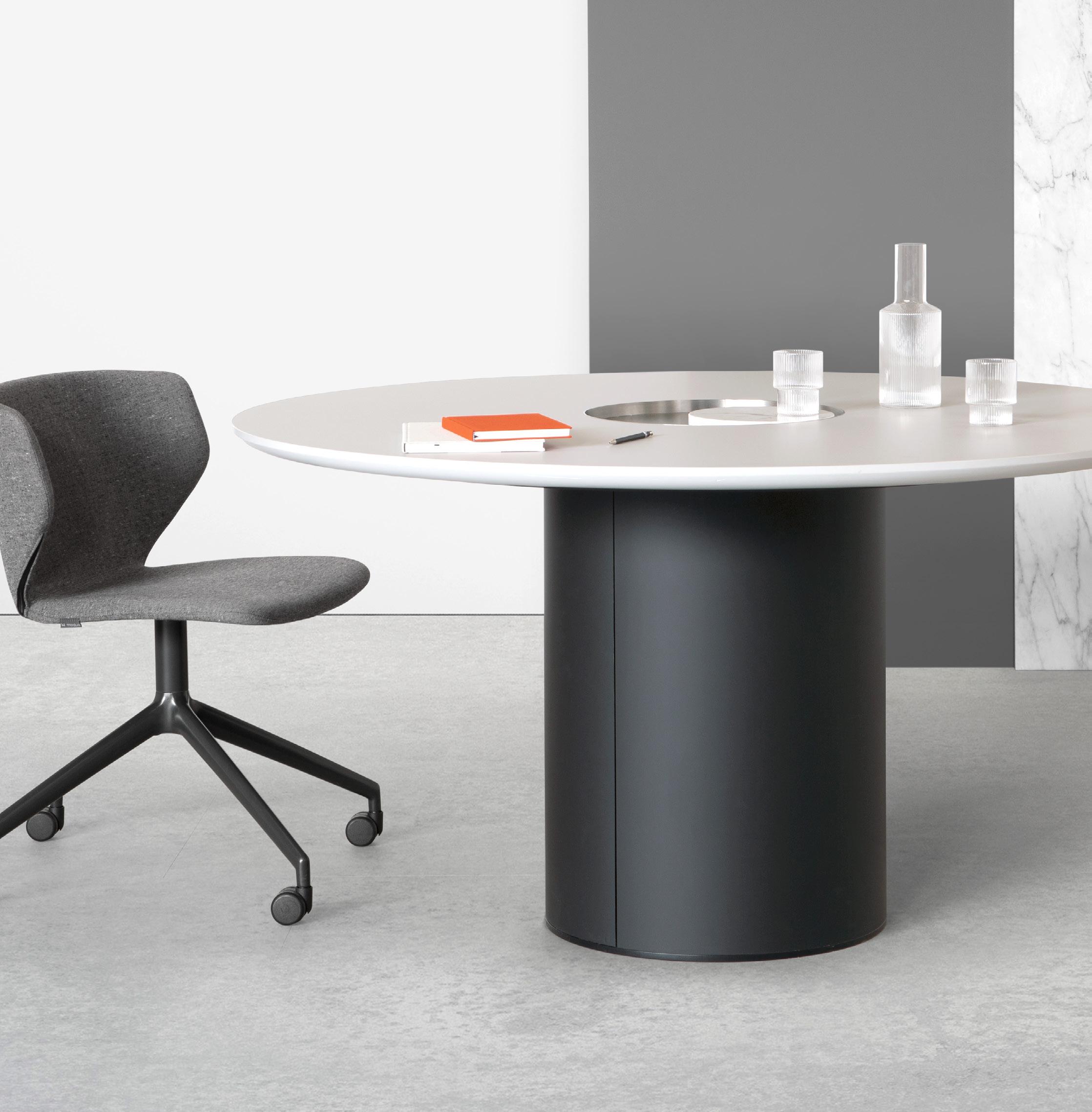 The circular tabletops of this collection feature a signature stone disc, which smoothly pivots around the sunken metal tray to reveal & conceal integrated connectivity outlets. The sleek cylindrical table base hides AV equipment, allows easy access to cable management and maintains a cable free environment.