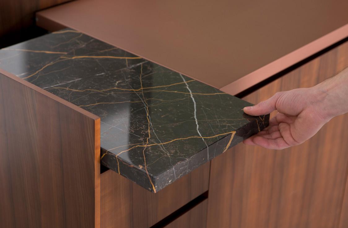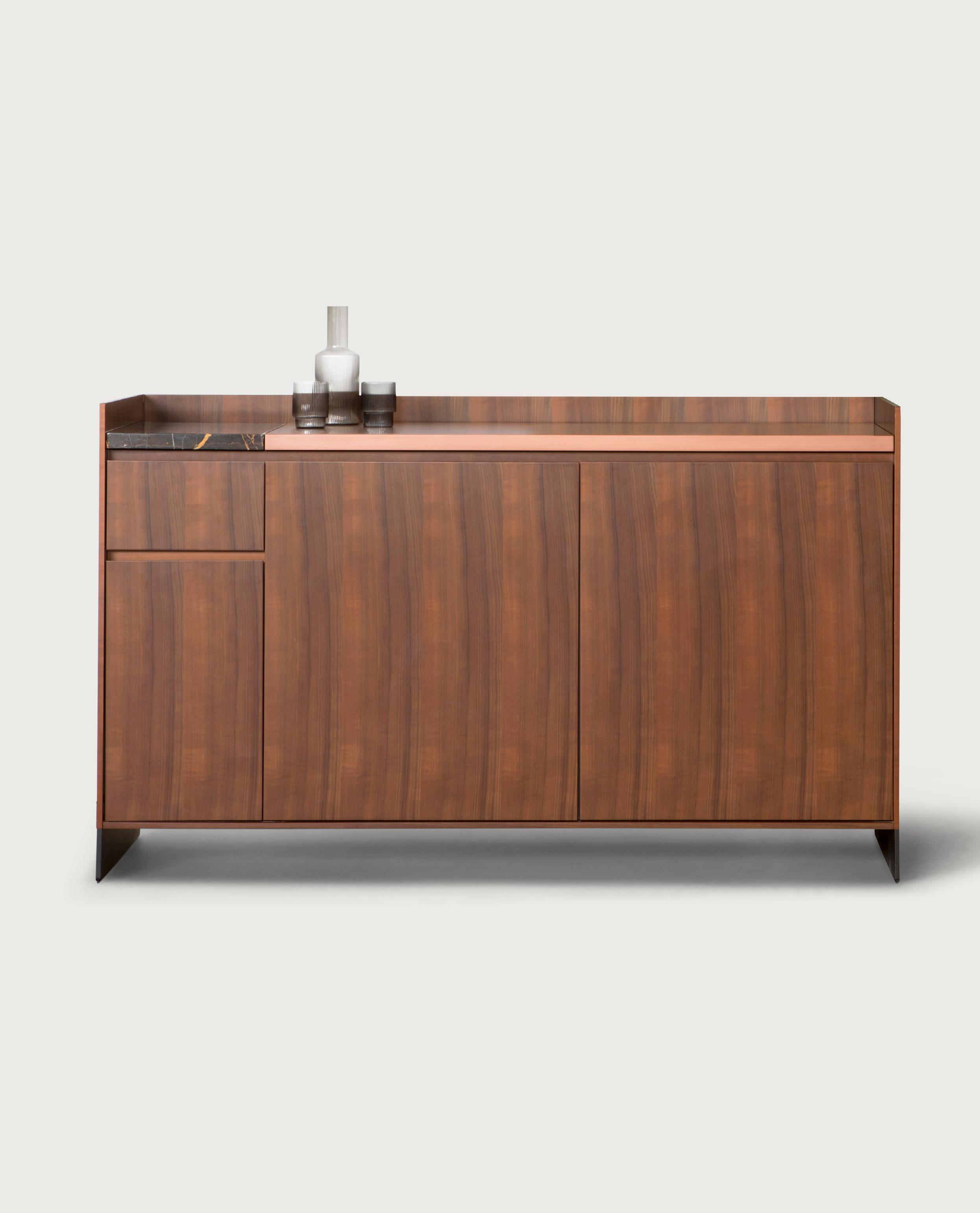 Far left: Object Credenza in Walnut veneer, with a bronze surface and marble plate.
