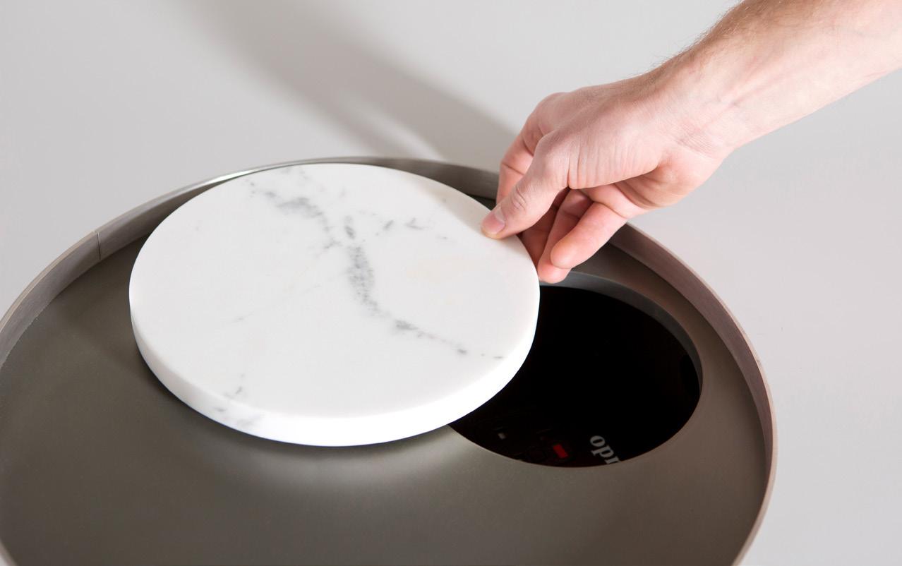 Above: Images show how the stone plate simply pivots around the sunken tray with a light touch to reveal access to power, then can be glide back into place while connected to maintain a tidy work surface.