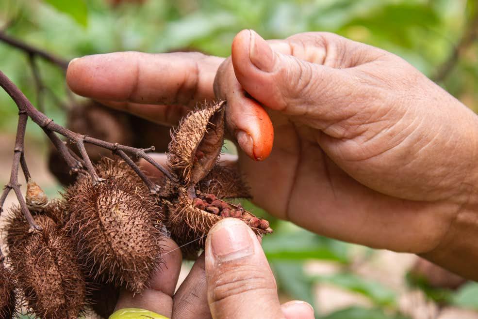 Em certo ponto do trajeto, ele aponta para um cajueiro e fala dos frutos que começam a vingar. Era agosto, início da temporada do caju. “Olha aí, que coisa linda, que coisa maravilhosa! Olha como é que já tá esse aqui ó! Cabo grosso já. Daqui uns 3 a 4 dias já tem caju”. Mais adiante, exclama: “É bom demais. Aqui é urucum, que a gente faz colorau”.