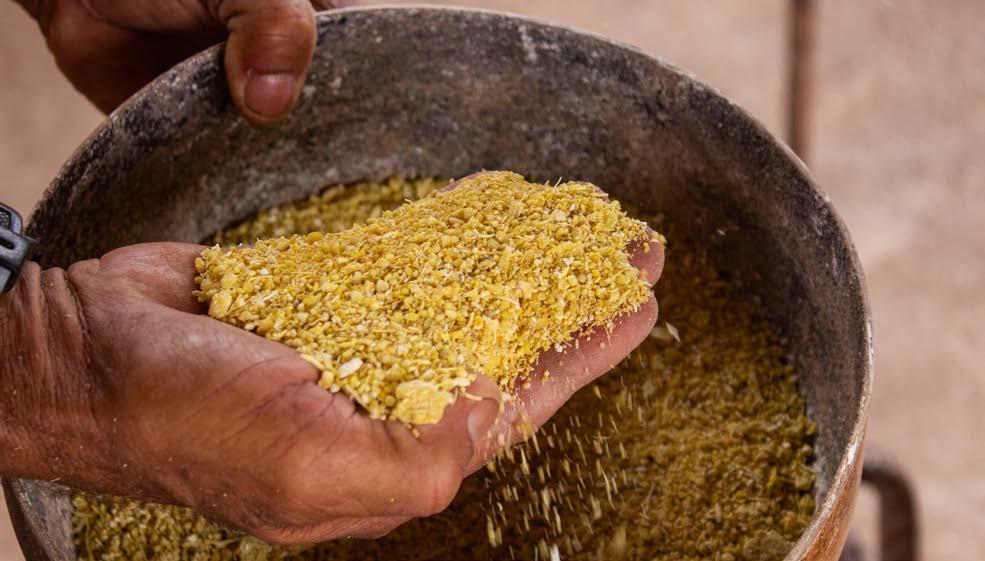 Ao chegarmos, Neile nos oferece um prato à base de goma de mandioca, o grolado. Passarinho também compartilha um pouco da farinha d’água feita por ele. O fazer da farinha aprendeu com o pai. Seu antigo sonho de construir uma casa de farinha se tornou realidade, ali, naquela estrutura que ele próprio ergueu.