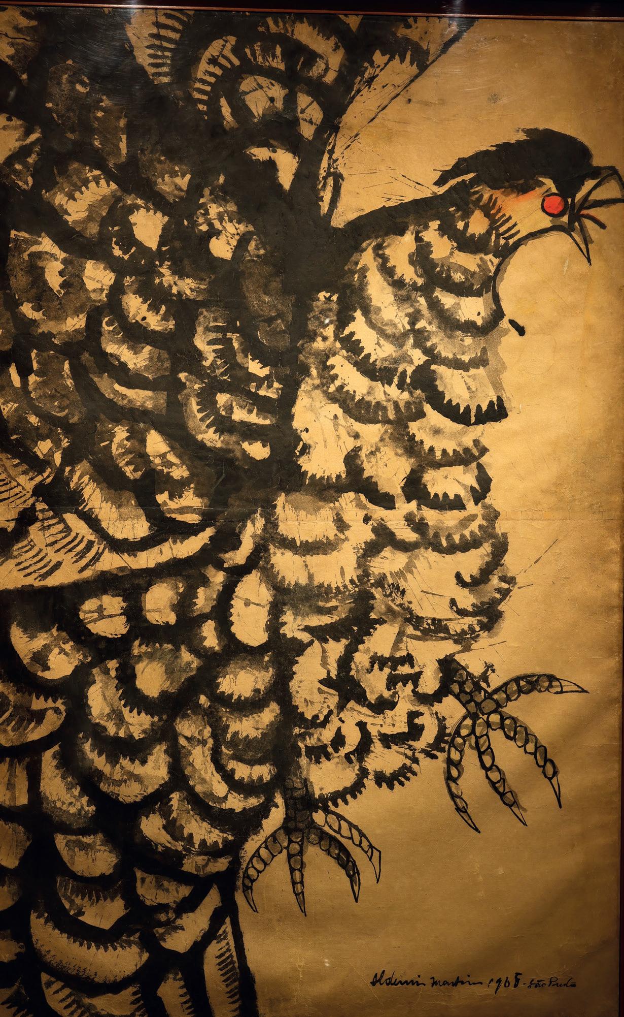 Aldemir Martins atuou na década de 1940 na formação da cena modernista cearense com os amigos Antônio Bandeira, Pierre Chabloz, Mario Barata e Barbosa Leite no Centro Cultural de Belas Artes, desdobrado na SCAP – Sociedade Cearense de Artes Plásticas. Em São Paulo, a partir de 1950, participa ativamente da cena modernista brasileira, relacionando-se com figuras-chave da cultura do País, como Assis Chateubriand e Pietro Maria Bardi. Época que ganha o Prêmio de Desenho na Bienal de São Paulo com O Cangaceiro ampliando sua temática povoada de nuances e tipos humanos nordestinos, aderente à experiência moderna no Brasil. Sempre afirmando sua raiz sertaneja de menino da Ingazeira do Sertão do Cariri, mesclando o imaginário de sua terra com traços gráficos peculiares e cores saturadas da energia do sol do Ceará, revelando também um bestiário fabuloso de galos, peixes e gatos. Um desses bichos – O Carcará, 1967, ganhou o valoroso Prêmio por Grafia na Bienal Internacional de Veneza de 1968. De olhos vermelhos, penugem preta arrepiada, bico aberto e unhas armadas para o bote, o bicho se espalha em guache e nanquim no imenso papel pardo, exposto na exposição Centelhas em Movimento, Coleção Igor Queiroz, no Espaço Cultural Unifor, arrebatando olhares e visitantes. O Carcará de Aldemir é símbolo de superação e resistência do povo nordestino que insiste em sobreviver, assim como do artista que sai de sua terra enfrentando os desafios de outras fronteiras em busca de um lugar ao sol. O carcará é o sol de Aldemir que espelha essa morte e vida severina, é luz e força para inspirar esses tempos”.
