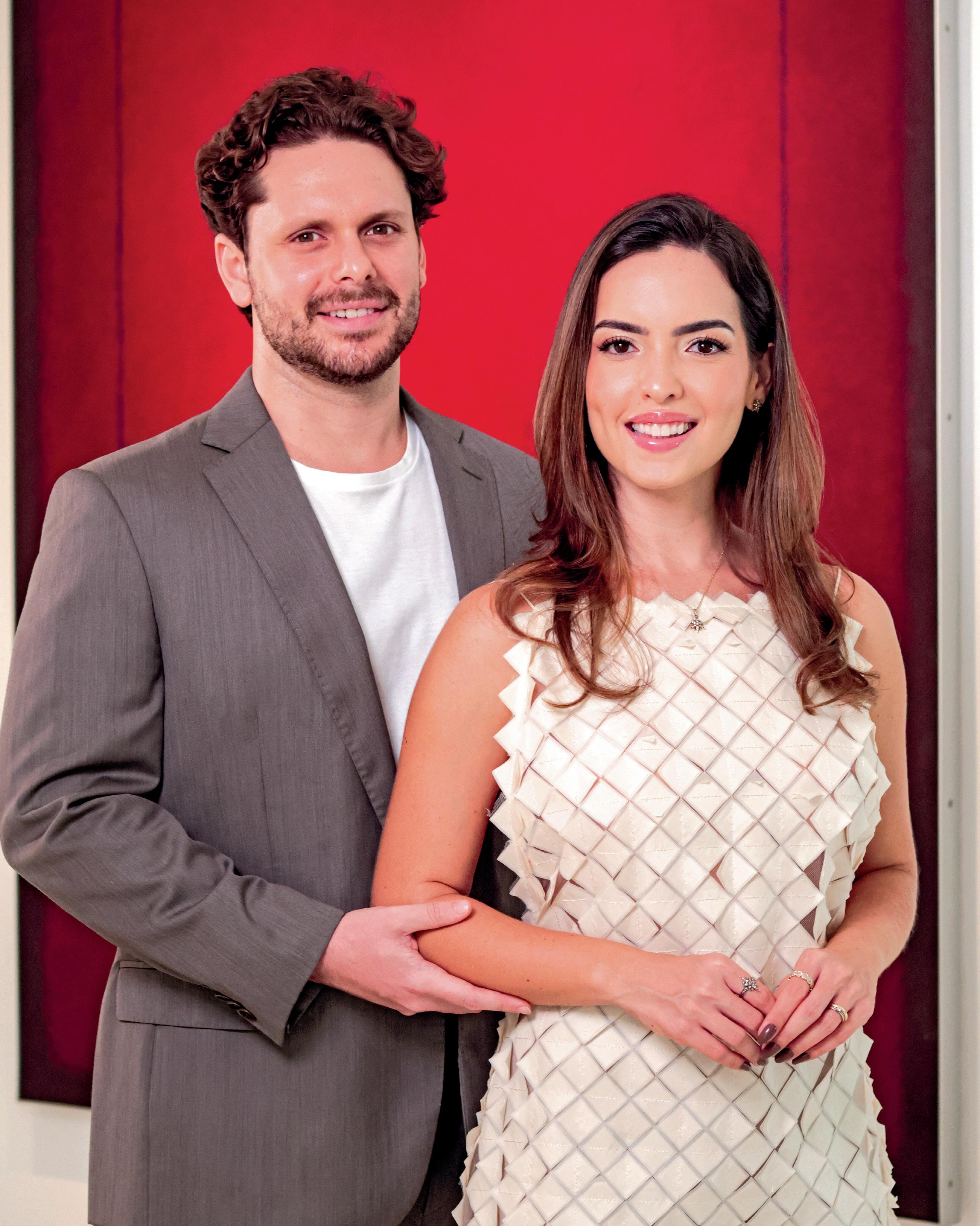 Casal posa entre duas obras do acervo da Galeria Multiarte: “Mobile Losange”, de Julio Le Parc; e a “Iemanjá”, de Zenon Barreto