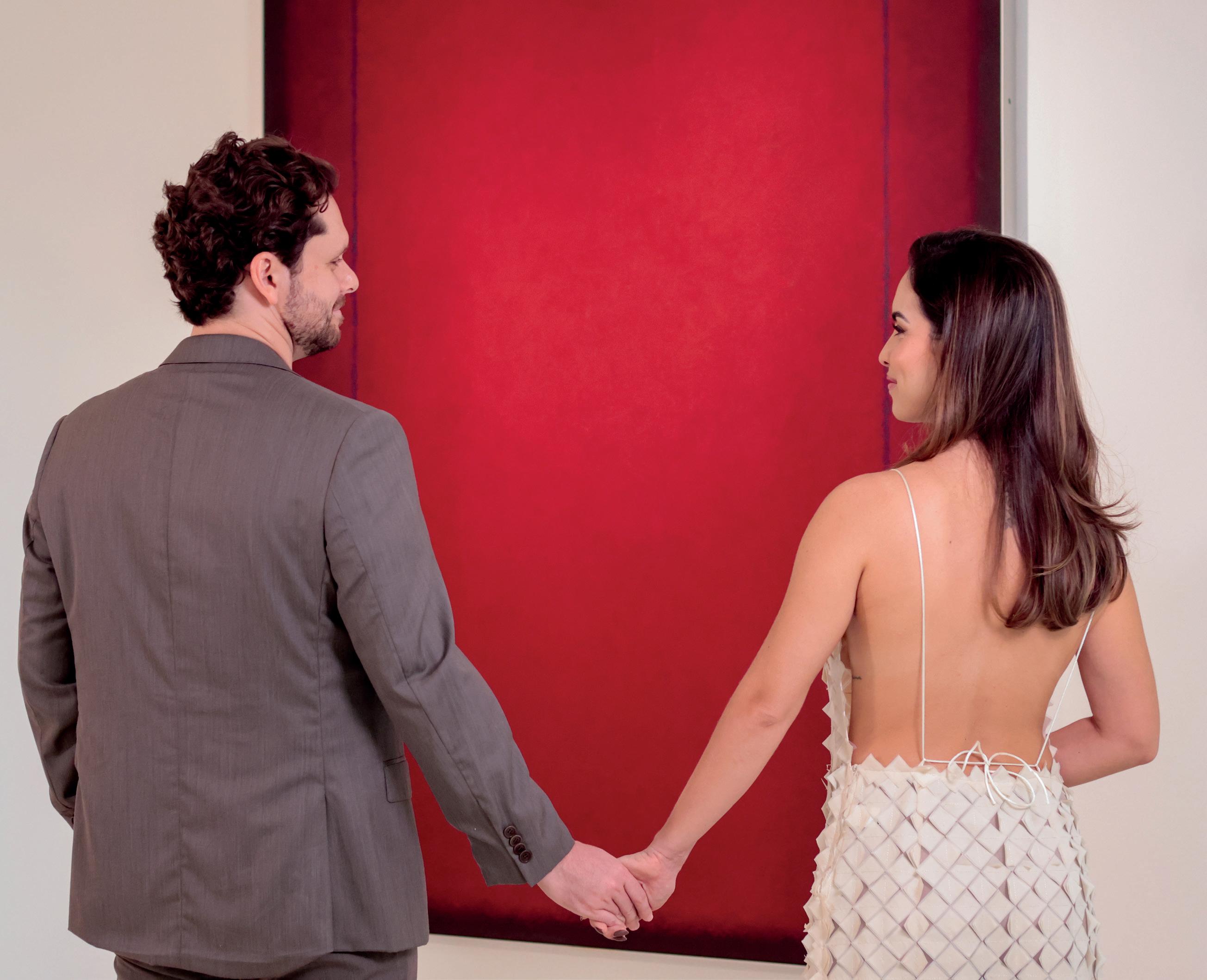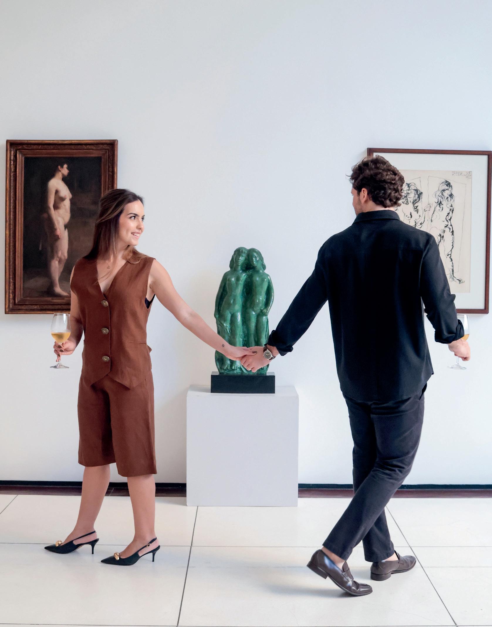 Enquanto faziam as fotos que ilustram estas páginas, Victor e Maria degustaram primeiramente um branco e depois um tinto. “Vocês aceitam? Acho que já podemos decretar nosso sextou, não é?”, disse ela sorridente ao marido. Antes de começarem os clicks do fotógrafo Samuel Setúbal, eu disse: “ele vai conduzir algumas poses, mas fiquem à vontade para se movimentarem”. Nem precisava da minha orientação. A química e a leveza do casal são evidentes e, entre taças e telas, por vezes me vi diante dessas cenas de filme romântico francês que se passam em galerias de arte.