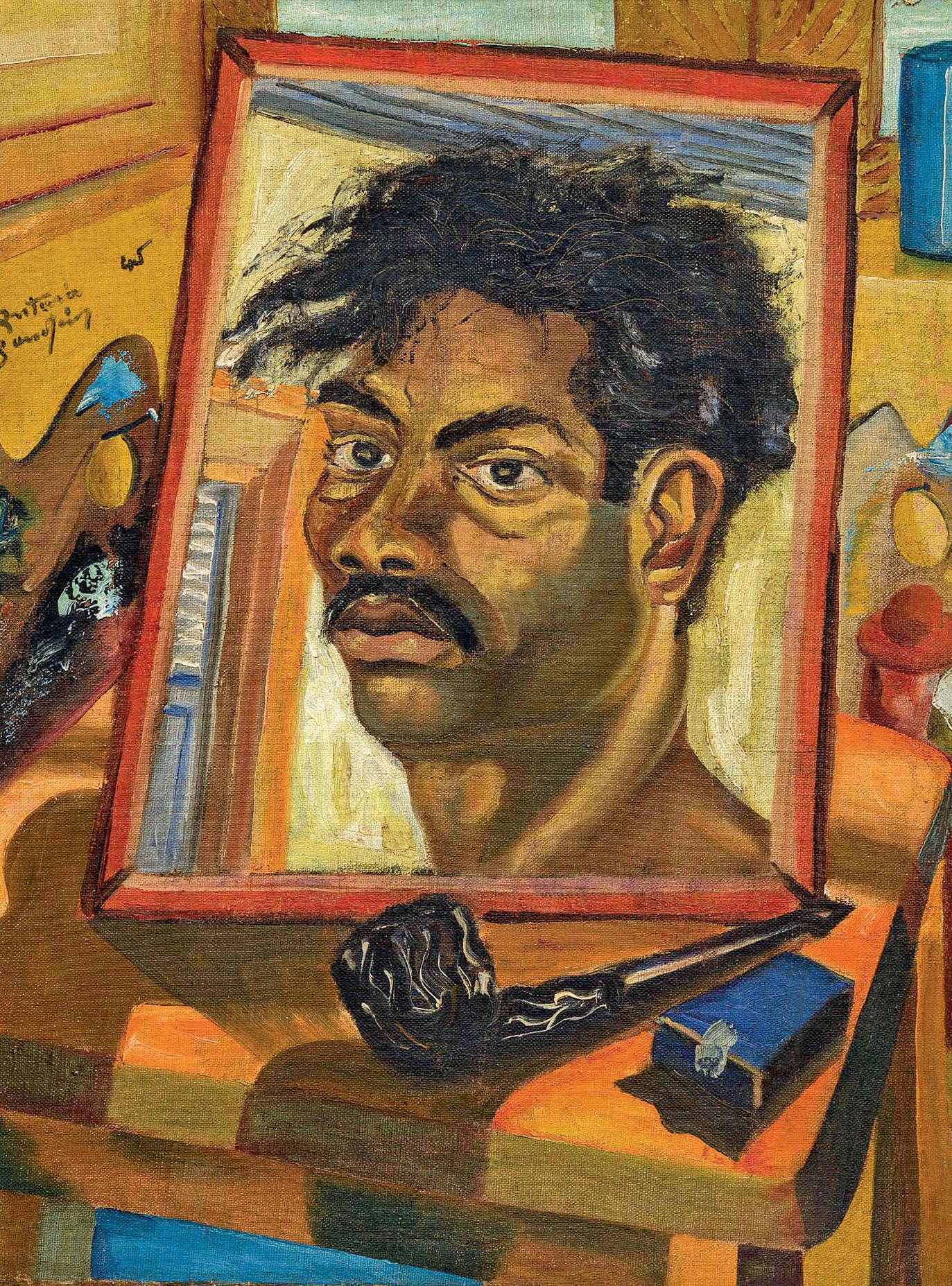 Entre o Bandeira real e o seu simulacro refletido, a imagem do jovem artista negro altivo em perfil, com cabelos despenteados e olhar intrépido. À sua frente, seu cachimbo exibindo o arquétipo do sábio intelectual acompanhado de uma simplória caixa de fósforo. A imagem do artista de poética crua e honesta como preâmbulo do artista fazedor de abstracionismo lírico que revolucionaria anos depois o campo artístico”.