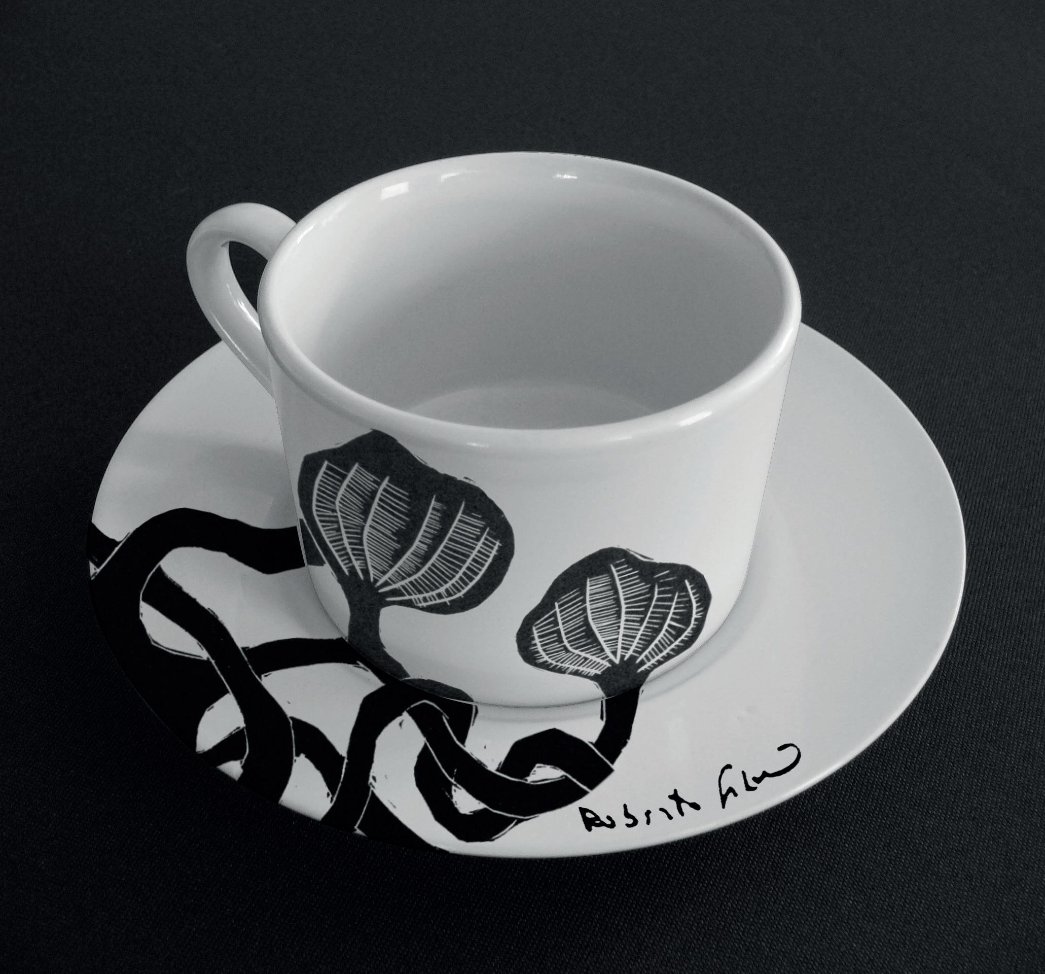 Ao longo da carreira, o trabalho de Roberto Galvão escorreu das telas para louças (foto), cadernos, rótulos de vinhos (como na exposição do Mauc) dentre outros objetos