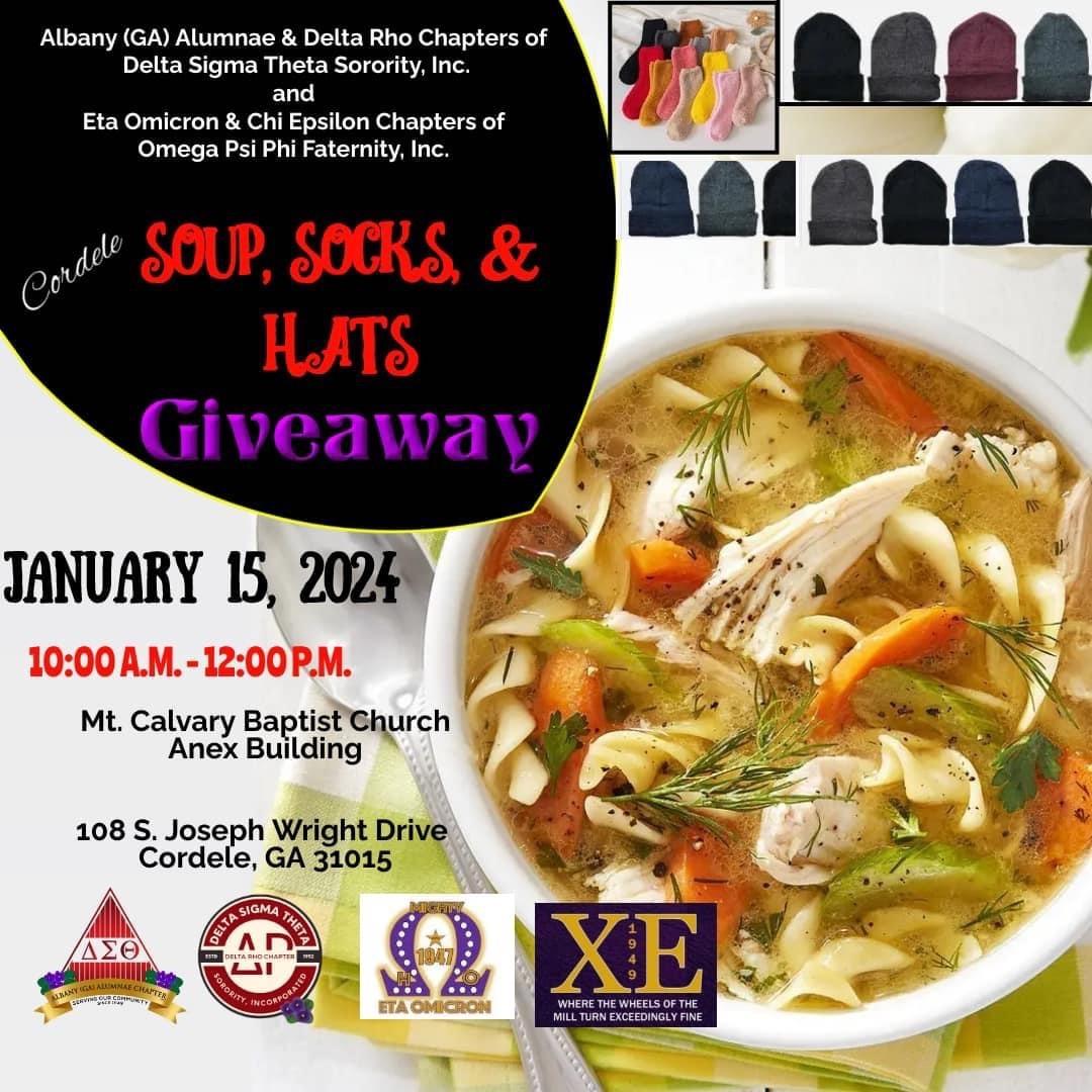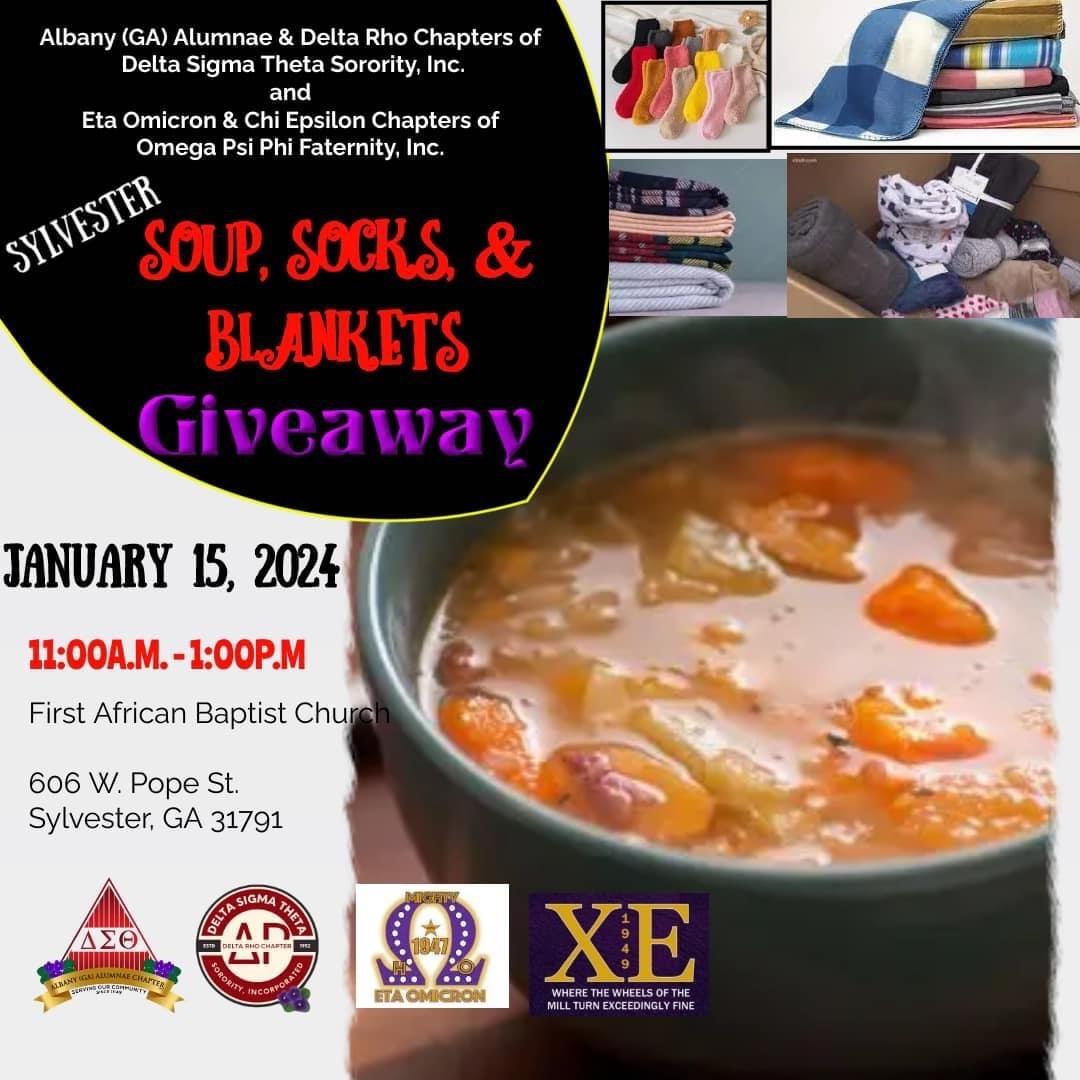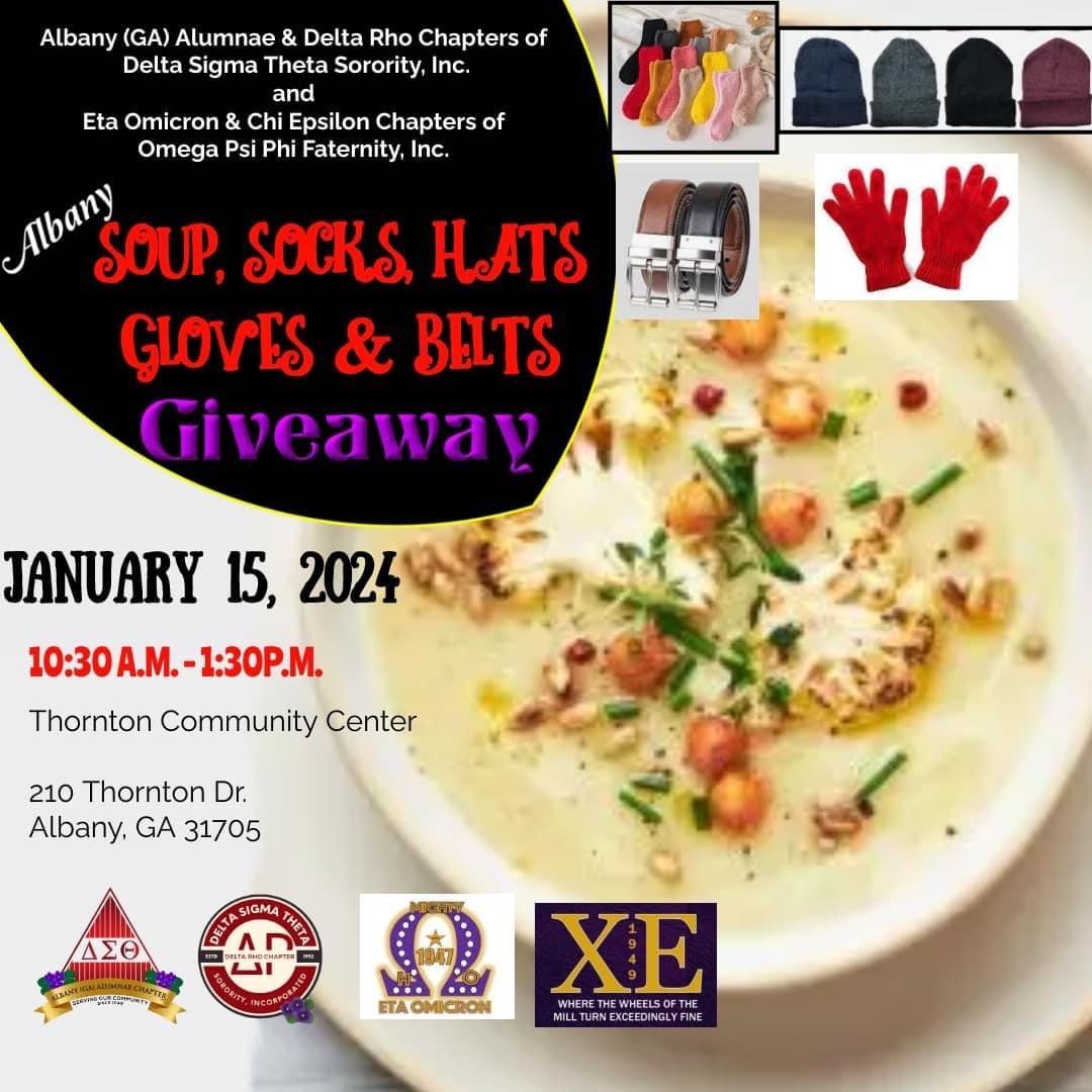 On January 15th, concurrent with the Dream March and MLK Day Program, we partnered with the ladies of Albany Alumnae and Delta Rho chapters of Delta Sigma Theta Sorority, Inc. for a hot soup, socks, belts, and blankets giveaway initiative. The giveaways were held simultaneously in three separate locations, Sylvester, Cordele, and Albany. Thanks goes out to all the brothers who signed up to participate during these events on this day. We could not have pulled this off without the support and efforts of the brothers.