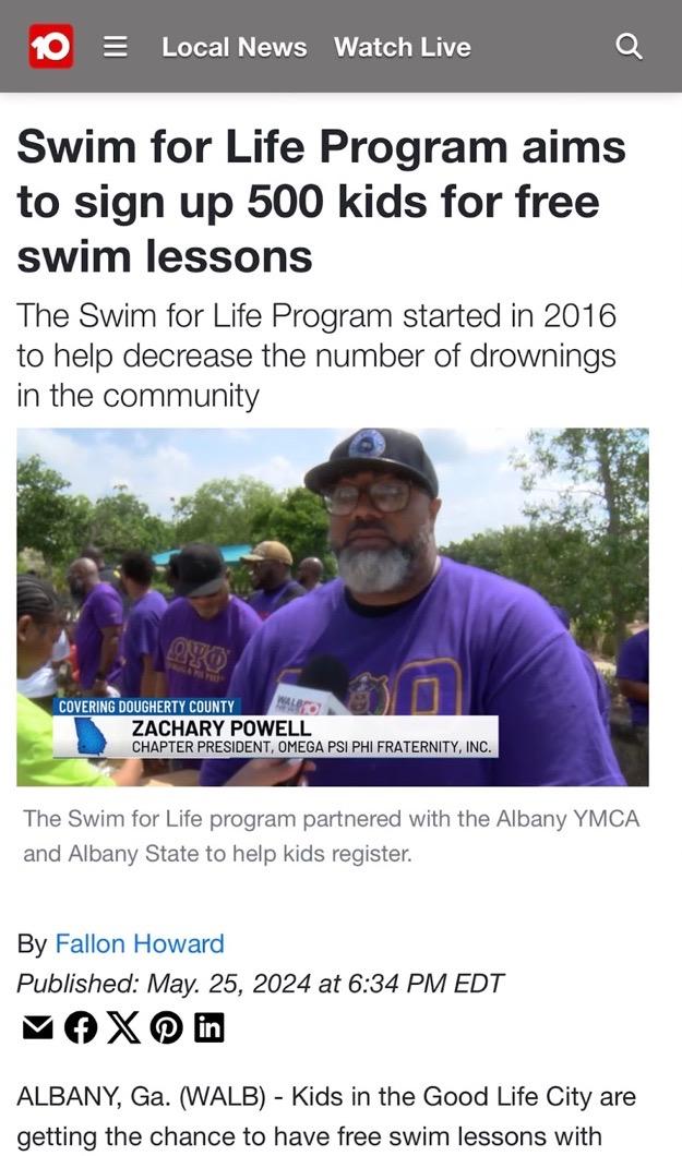 On May 25th, the brothers of Eta Omicron and Chi Epsilon partnered with the Dougherty County Coroner, Michael Fowler, and his office to ensure that the youth of our county are offered swimming lessons to reduce the drowning deaths that occur each year, especially during the summer months. This year, the chapter gave a $500 donation to the program to help purchase swimsuits and supplies for those in need. We were also featured on the WALB News 10 Evening Broadcast. This annual event has become a key summer partnership.
