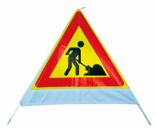 Foldeskiltet leveres med klasse 3 fluorescerende refleks, etui for oppbevaring og lodd for å holde skiltet på plass