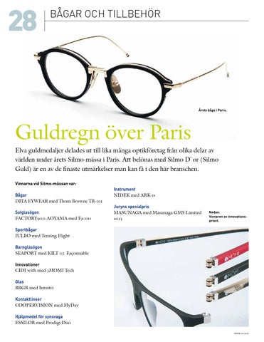 Guldregn över Paris Elva guldmedaljer delades ut till lika många optikföretag från olika delar av världen under årets Silmo-mässa i Paris. Att belönas med Silmo D`or (Silmo Guld) är en av de finaste utmärkelser man kan få i den här branschen. Vinnarna vid Silmo-mässan var: Instrument Bågar