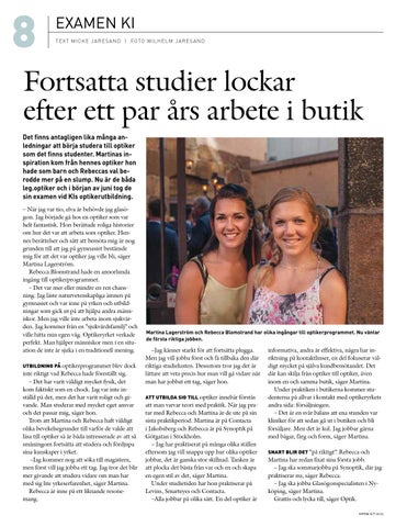 informativa, andra är effektiva, några har inriktning på kontaktlinser, en del fokuserar väldigt mycket på själva kundbemötandet. Det där kan skilja från optiker till optiker, även inom en och samma butik, säger Martina. Under praktiken i butikerna kommer studenterna på allvar i kontakt med optikeryrkets andra sida: försäljningen. – Det är en svår balans att ena stunden var kliniker för att sedan gå ut i butiken och bli försäljare. Men det är kul. Jag jobbar gärna med bågar, färg och form, säger Martina. Snart blir det ”på riktigt”. Rebecca och Martina har redan fixat sina första jobb. – Jag ska sommarjobba på Synoptik, där jag praktiserar nu, säger Rebecca. – Jag ska jobba Glasögonspecialisten i Nyköping, säger Martina. Grattis och lycka till, säger Optik. optik 6 /7-2013