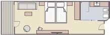 Doccia, WC, per lo più con bidet, fon, specchio cosmetico, teli sauna, accappatoi, aria condizionata, pavimento in legno, per lo più con divano, poltrona relax, minibar, TV sat flat, telefono, Wi-Fi, safe e balcone a sud-ovest.