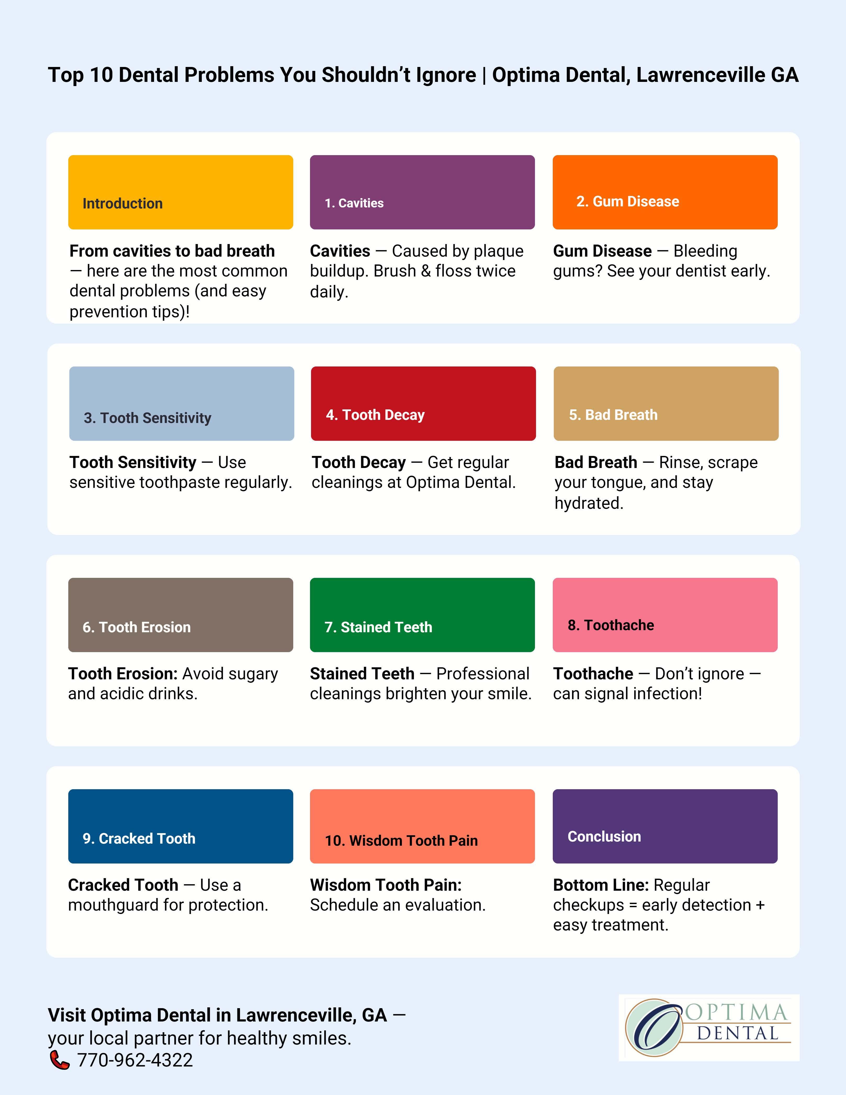 Spot the early warning signs before they turn into bigger problems. This fast, patient-friendly guide from Optima Dental in Lawrenceville, GA reveals the top dental issues people often ignore—and why quick care can save your smile, time, and money.