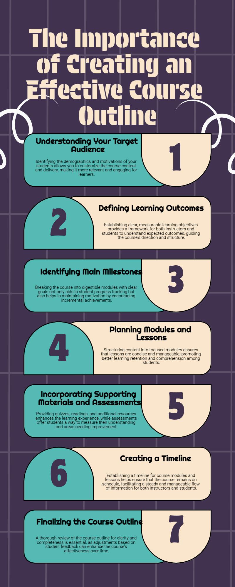 Discover the power of a well-structured course outline! Learn how to create effective learning experiences by defining clear learning outcomes, planning engaging modules, and incorporating valuable assessments. This infographic provides essential tips for building a successful course outline.