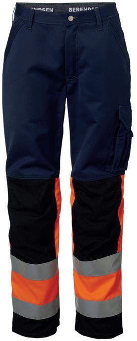 Justerbar semielastisk midja. Sidofickor och genomgående öppningar. Bröstoch bakfickor. Ögla för ID-kort i höger sidoficka. Benficka med mobilficka. Dubbel tumstocksficka med pennficka. Förformade knän med knäfickor. Förstärkt material på knän och i nederkant. Stängs med plastknappar (111159 stängs med dragkedja och plastknappar).
