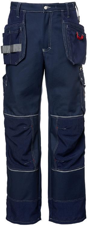 Bak- och sidofickor. Benficka med mobilficka. Hängfickor för verktyg. Tumstocksficka med knivhållare och pennficka. Förformade knä med knäfickor. Förstärkt material på knän och i nederkant. Stängs med dubbla plastknappar i midjan. Alla knappar och blixtlås är av plast.