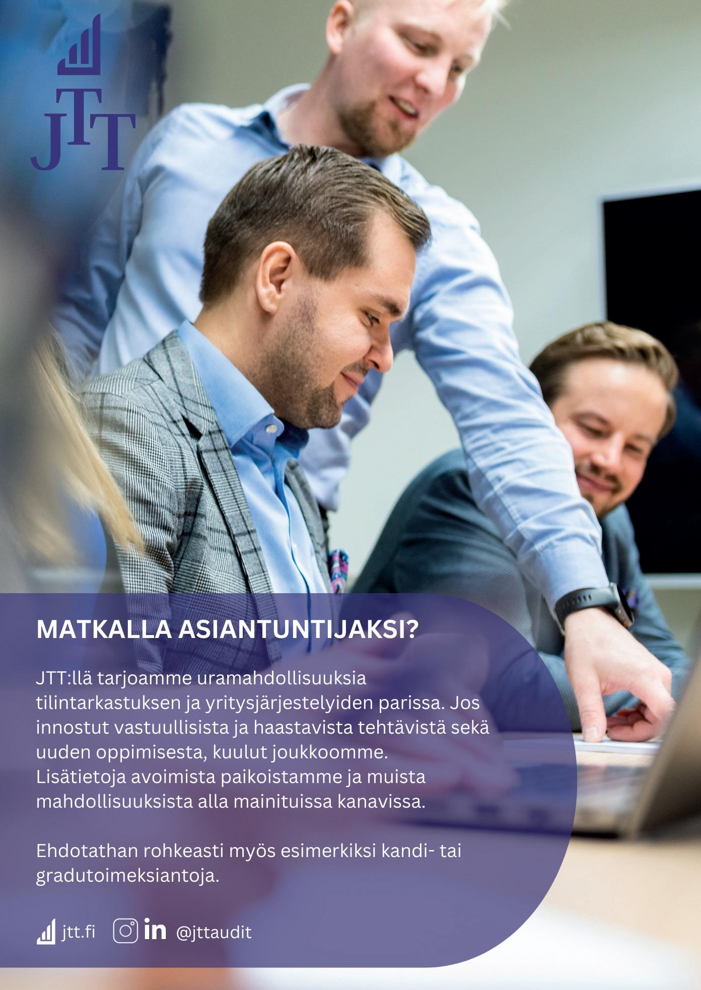 EY tarjoaa uramahdollisuuksia opiskelijoille, vastavalmistuneille ja kokeneille ammattilaisille tilintarkastuksen, konsultoinnin, veropalveluiden, yritysjärjestelyiden ja liikejuridiikan parissa. Meillä saat vastuuta ja pääset käsiksi monipuolisiin tehtäviin kansainvälisessä työympäristössä. Haemme jatkuvasti eri alojen osaajia kasvavaan joukkoomme! Lisätietoja EY:n tarjoamista mahdollisuuksista löydät seuraavista kanavista: