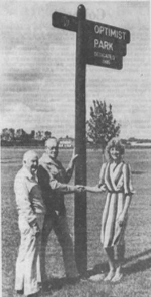 May 1985 Optimist Park dedication – featuring Harold Heinecke (Noon Club member), unknown man, and Mrs. Barbara Trautman (the woman who campaigned to establish a City park in her neighborhood)