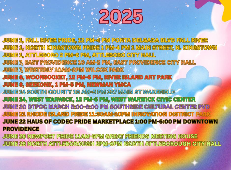 RI Pride: Open house 4th Wednesdays. Festival & Parade 3rd Saturday in June. Mail: PO Box 1082, Providence, 02903. 1-401-4672130. info@prideri.com, www.prideri.com.