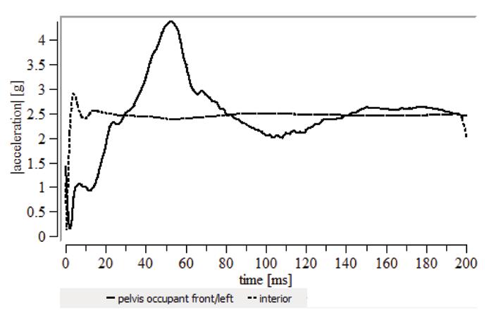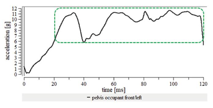 Analysis of the VC 1 load case, shows pelvis acceleration peaks of about 11 g and an average acceleration of 10 g over a time period of 100 ms (green area in Figure 9).