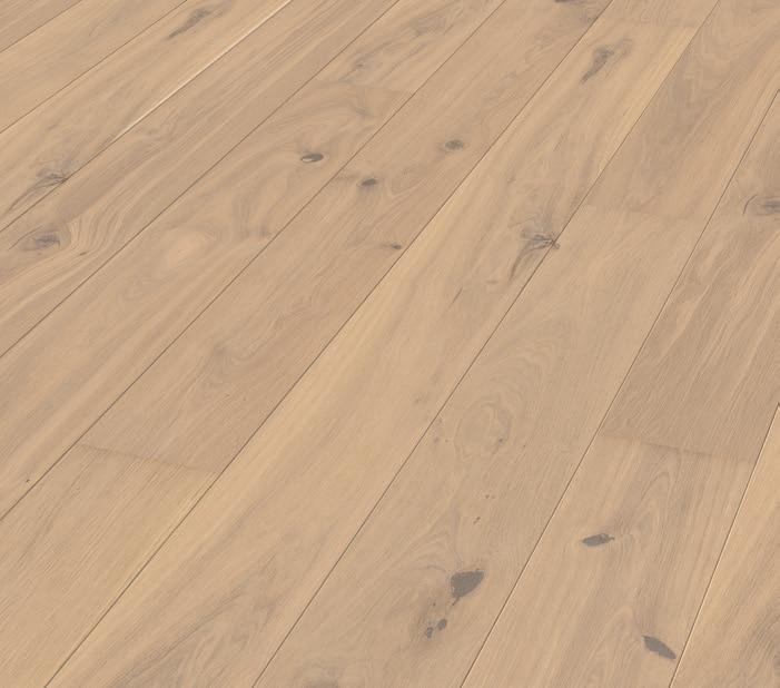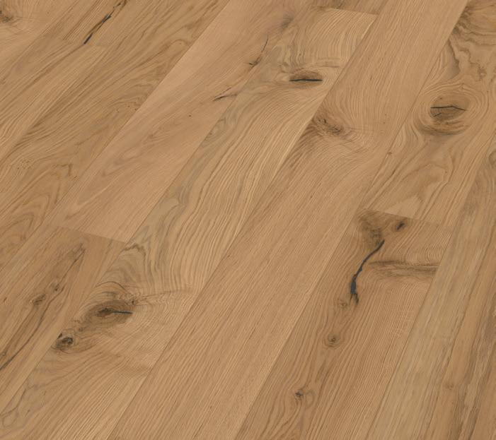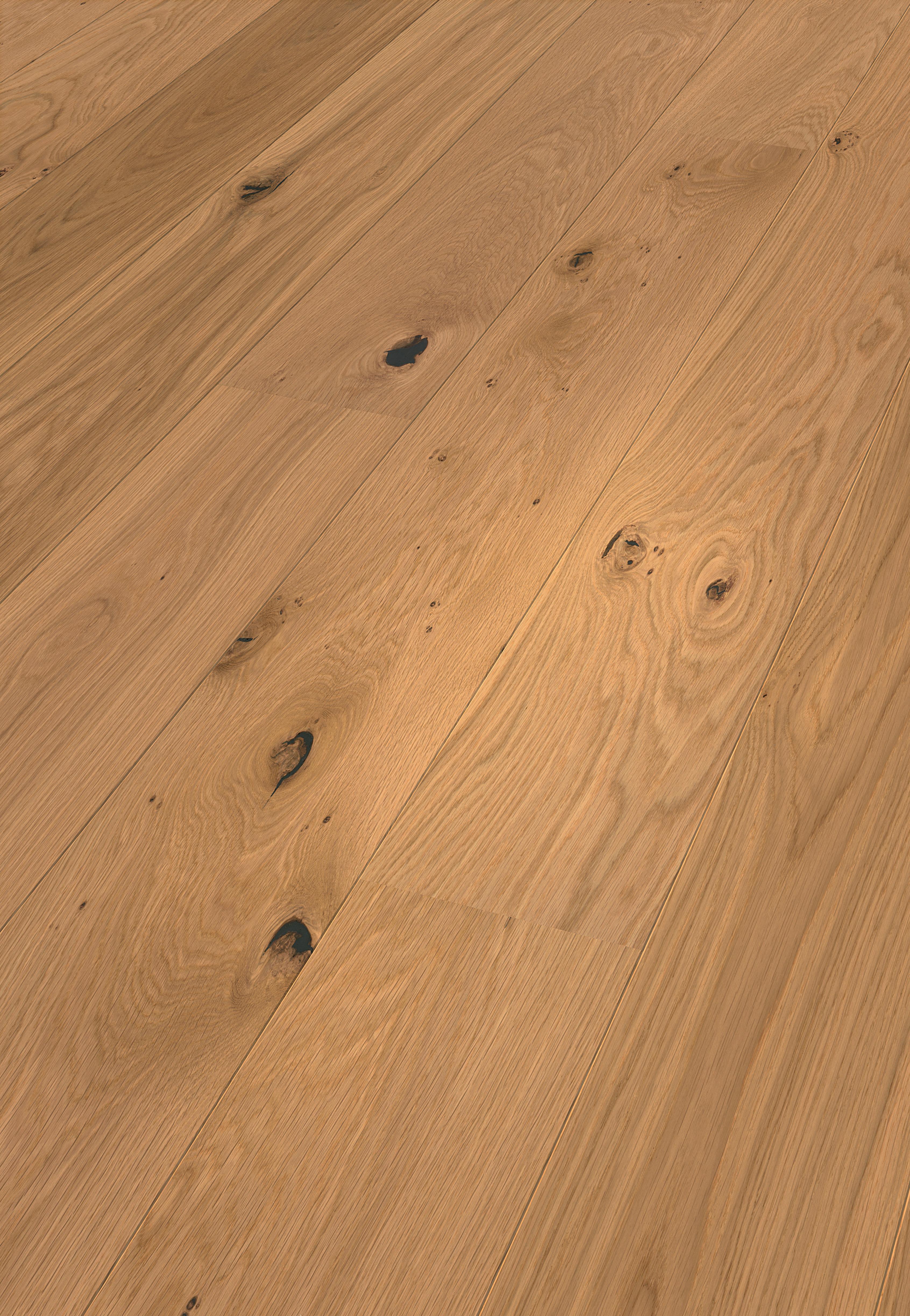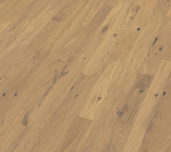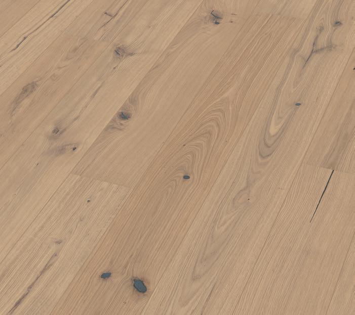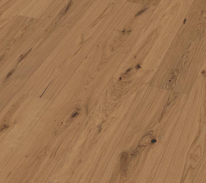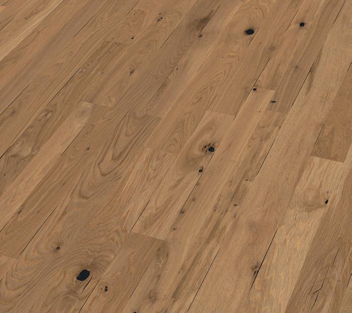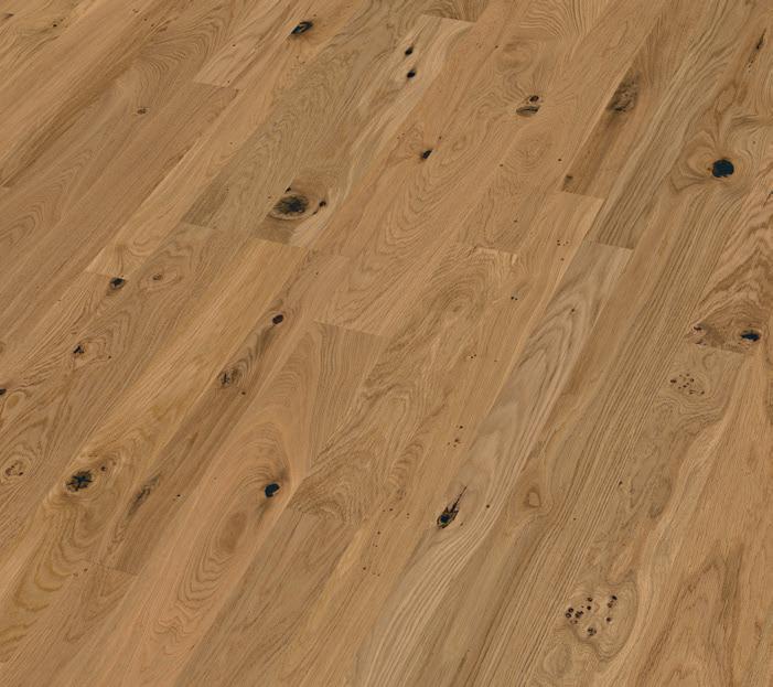 Edelhölzer mit ausgeprägtem Farb- und Strukturspiel bieten die Grundlage für diese Sortierung. Der natürli che und urwüchsige Charakter des Bodens wird betont durch größere Äste und unterschiedlich starke Risse. Splintanteile sind bei dieser Sortierung nicht vorhan den. Astausbrüche und Risse werden fachmännisch ausgespachtelt. Kleine nicht spachtelfähige Risse und Äste können vorkommen. Bei der Kollektion PC 400 mit naturgeölten Oberflächen sind die Äste und Risse unregelmäßig ausgespachtelt und in Kombination mit dem unregelmäßig produzierten Fugenbild besitzt der Boden eine besonders ausdrucksstarke Optik.