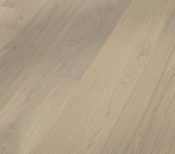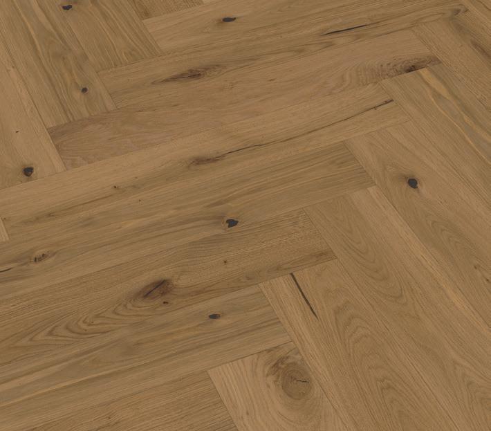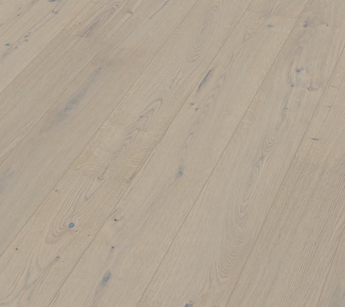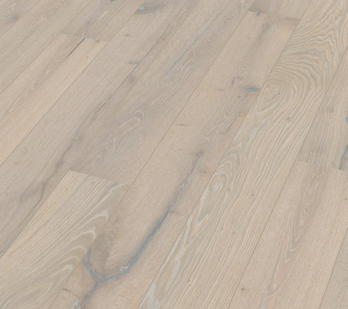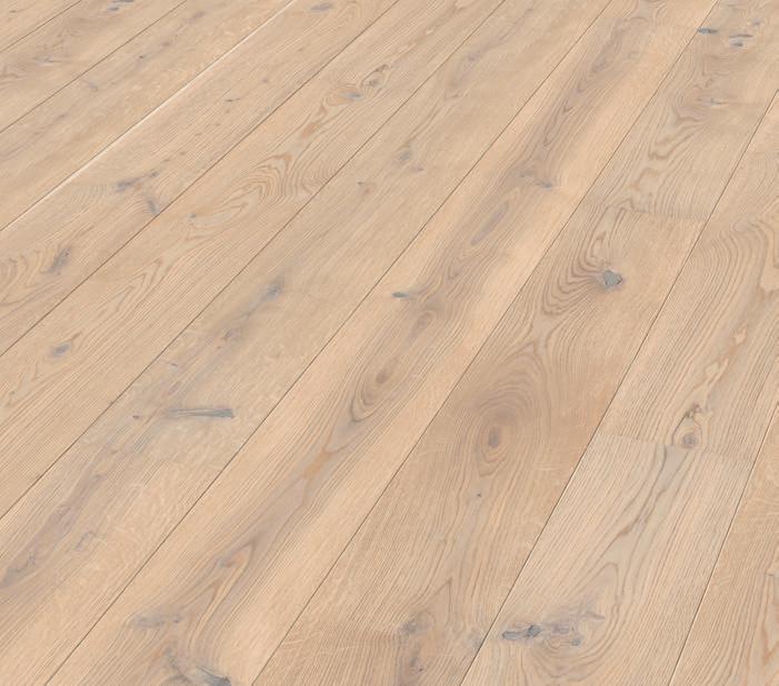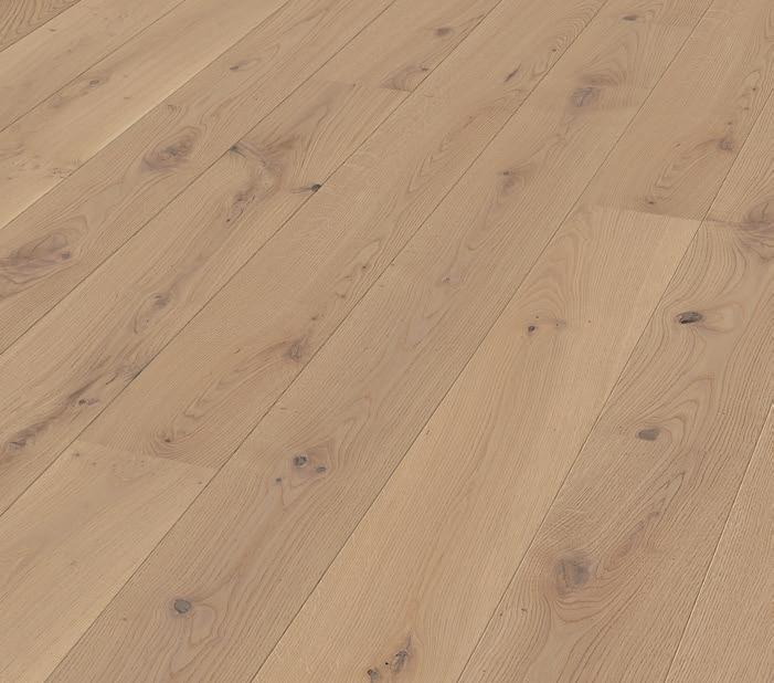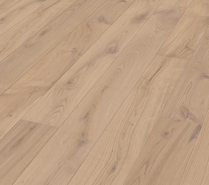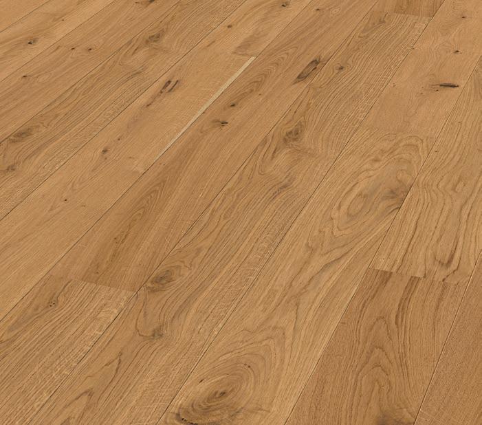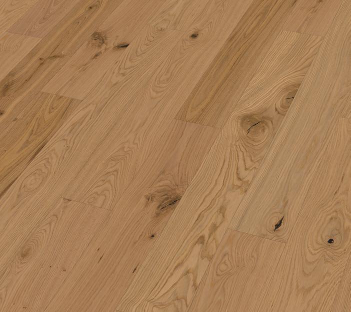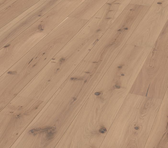 Edelhölzer mit ausgeprägtem Farb- und Strukturspiel bieten die Grundlage für diese Sortierung. Der natürli che und urwüchsige Charakter des Bodens wird betont durch größere Äste und unterschiedlich starke Risse. Splintanteile sind bei dieser Sortierung nicht vorhan den. Astausbrüche und Risse werden fachmännisch ausgespachtelt. Kleine nicht spachtelfähige Risse und Äste können vorkommen. Bei der Kollektion PC 400 mit naturgeölten Oberflächen sind die Äste und Risse unregelmäßig ausgespachtelt und in Kombination mit dem unregelmäßig produzierten Fugenbild besitzt der Boden eine besonders ausdrucksstarke Optik.