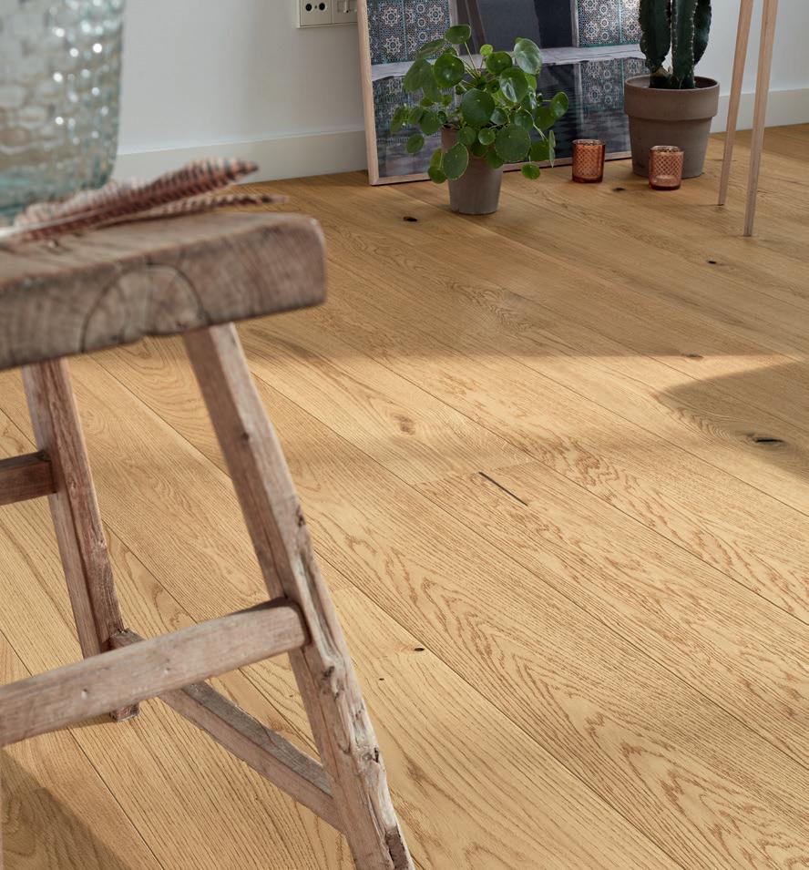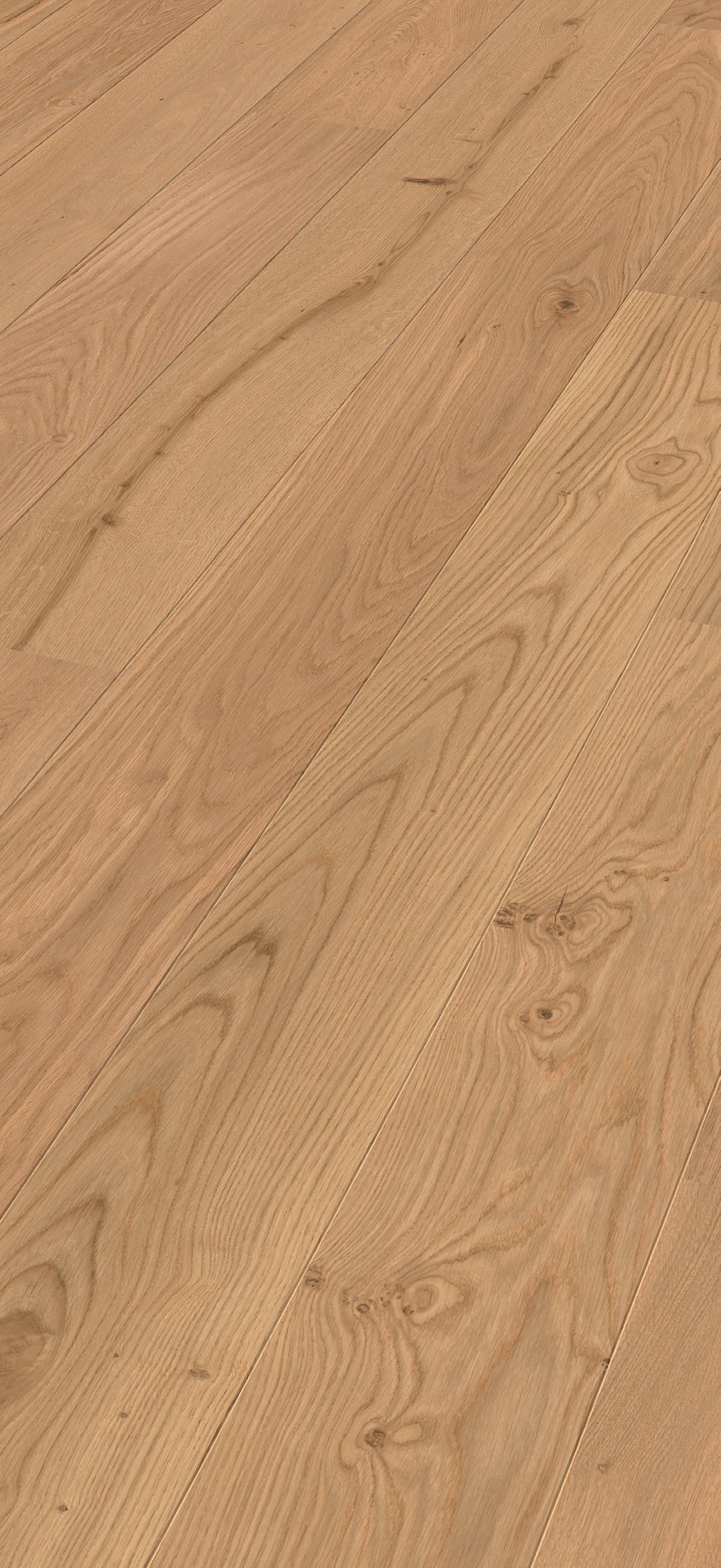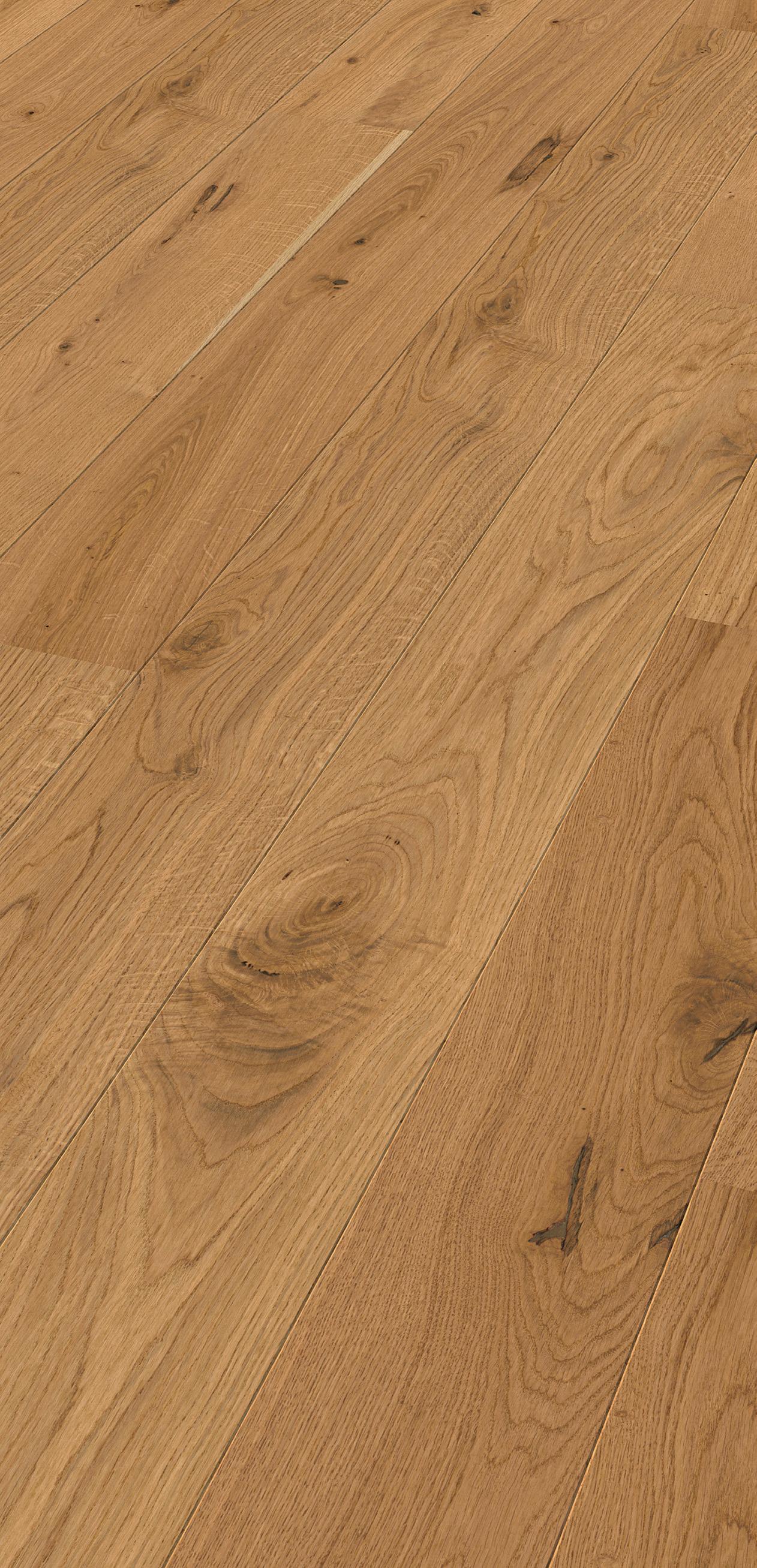 In dieser Sortierung bieten wir bewusst Oberflächen mit Farb- und Strukturspiel, die den natürlichen Cha rakter des Holzes betonen. Gesunde Ast-, Splint- und Braunkernanteile gehören zum lebhaften Gesamtbild. Unsere Eiche-Landhausdielen und Eiche Maxi-Stäbe sind in dieser Sortierung splintfrei. Astausbrüche werden fachmännisch ausgespachtelt. Kleine nicht spachtelfähige Risse und Äste können vorkommen.