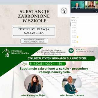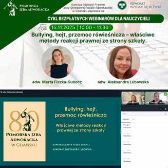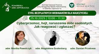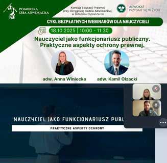W pierwszej kolejności kierowane są one do nauczycieli, pedagogów, psychologów, dyrektorów i wszystkich pracowników oświaty, którzy wzięli udział w szkoleniach. Ich codzienna praca jest trudna, wymagająca ogromu zaangażowania, cierpliwości i odporności, a jednocześnie zbyt często pozostaje niedoceniona. To właśnie ich gotowość do rozwoju, otwartość na nowe rozwiązania i troska o bezpieczeństwo uczniów sprawiają, że edukacja prawna ma sens i realny wpływ na funkcjonowanie szkół. Ponad tysiąc uczestników tegorocznego cyklu to jasny dowód, że mimo licznych wyzwań nauczyciele nie przestają szukać wiedzy, która pozwala im działać lepiej i pewniej. Szczególne podziękowania należą się również adwokatom Pomorskiej Izby Adwokackiej, Członkom Komisji Edukacji Prawnej przy Okręgowej Radzie Adwokackiej w Gdańsku, którzy przygotowali i poprowadzili wszystkie webinarowe spotkania. Ich kompetencje, zaangażowanie i umiejętność przekładania złożonych zagadnień prawnych na praktyczne wskazówki były wielokrotnie podkreślane w opiniach uczestników.