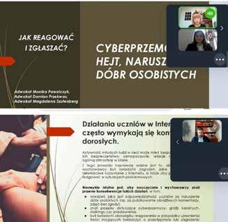 Pierwszy webinar poświęcony był statusowi nauczyciela jako funkcjonariusza publicznego. Adw. Anna Winiecka oraz Adw. Kamil Olzacki omówili zakres ochrony prawnej, jaką ustawodawca przewidział dla pracowników oświaty, a także praktyczne procedury reagowania w sytuacjach naruszenia ich dóbr osobistych, godności czy bezpieczeństwa. W spotkaniu wzięło udział niemal trzysta osób, a liczba zadawanych pytań pokazała, jak często nauczyciele zmagają się z niełatwymi sytuacjami konfliktowymi z uczniami i rodzicami oraz jak bardzo potrzebują wsparcia opartego na rzetelnej wiedzy prawniczej. Drugie szkolenie dotyczyło cyberprzemocy i hejtu, które coraz częściej przenikają do szkolnej codzienności. Adw. Monika Pawelczyk, Adw. Magdalena Szutenberg i Adw. Damian Przekwas przedstawili uczestnikom narzędzia prawne umożliwiające właściwą reakcję na naruszenia w Internecie, metody dokumentowania zdarzeń oraz za-