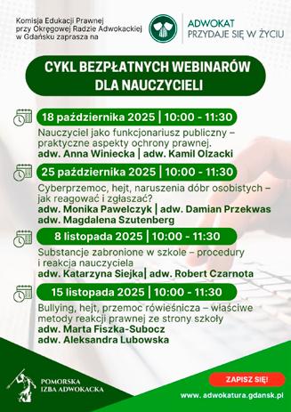 Jesienny cykl webinarów przygotowany przez Komisję Edukacji Prawnej przy Okręgowej Radzie Adwokackiej w Gdańsku przyciągnął rekordową liczbę uczestników – ponad tysiąc nauczycieli, pedagogów i psychologów z całej Polski. W czterech specjalistycznych spotkaniach adwokaci Pomorskiej Izby Adwokackiej dzielili się wiedzą i praktycznymi wskazówkami, wspierając szkoły w rozwiązywaniu realnych problemów wychowawczych i prawnych, z którymi mierzy się współczesna oświata.