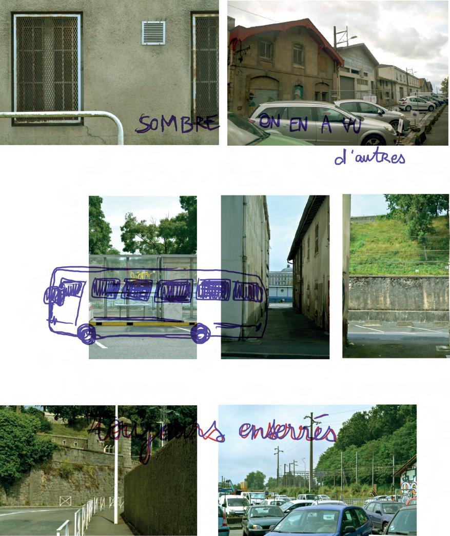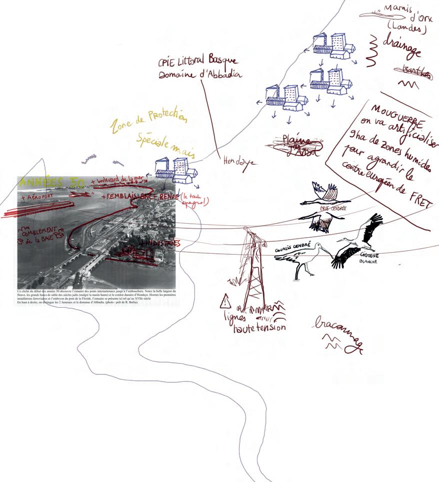 Partant de l’existant, du contexte actuel, m’intéressant au passé historique valant au pays basque sa qualité de «terre d’accueil», je vais dans ce mémoire démêler les fils des quatre passages énoncés : leur route, les gens et structures impliquées dans celle-ci, les conflits rencontrés et leurs besoins. Alors je déterminerai des cadrages où viennent à se croiser ces quatre figures. J’analyserai comment l’arpentage transforme un espace en lieu, et déterminerai alors des enjeux localisés selon l’étude faite au préalable. J’essaierai de déterminer ce qu’est un paysage du passage, et ce que le paysage peut apporter aux migrations. Enfin, je vous emmènerai dans quatre grands lieux de croisement puis commencerai à imaginer un projet d’aménagement ayant la migration comme cœur de pensée.