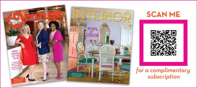 Interior Appeal and Orange Appeal make great gifts! Subscribe at orangeappeal.com. Get all the event info by signing up for the e-newsletter or visiting our interactive website. For changes of address, please e-mail subscriptions@orangeappeal.com.