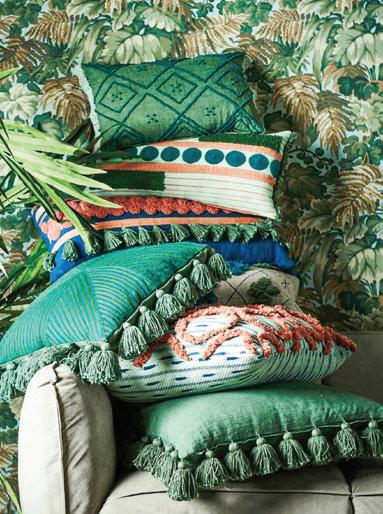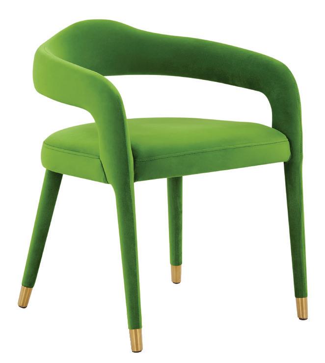 Clockwise from top right: L & DS Lighting Design Studio: West Java Lighting Collection; Condor: Jungle Pillow Collection; HB Home (division of Imperial): Fulton Wine Cabinet; ModShop: Acapulco 2 Dining Chair in Velvet; and TOV: Lucia Green Velvet Dining Chair.