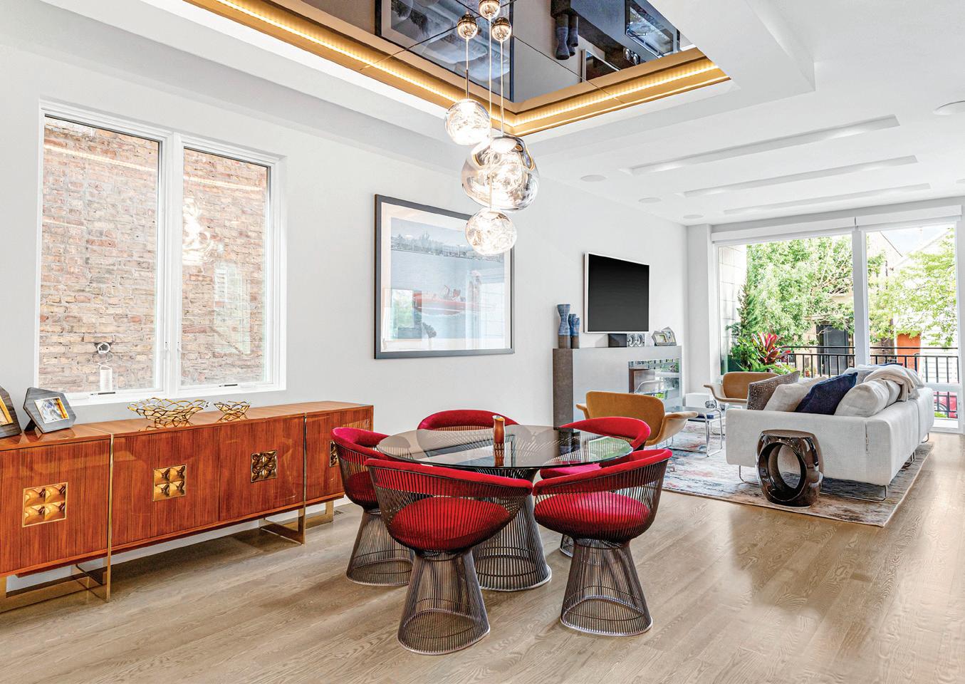 Ted Maines Interiors created an urban oasis in this stylish Chicago townhome. The living and dining area is defined by a Bolier credenza, Platner dining table, Knoll chairs, and a sofa by Mariani. A Tom Dixon Melt chandelier is suspended from the mirrored ceiling for a touch of drama. Artwork by Slim Aarons completes this sophisticated, modern living space.