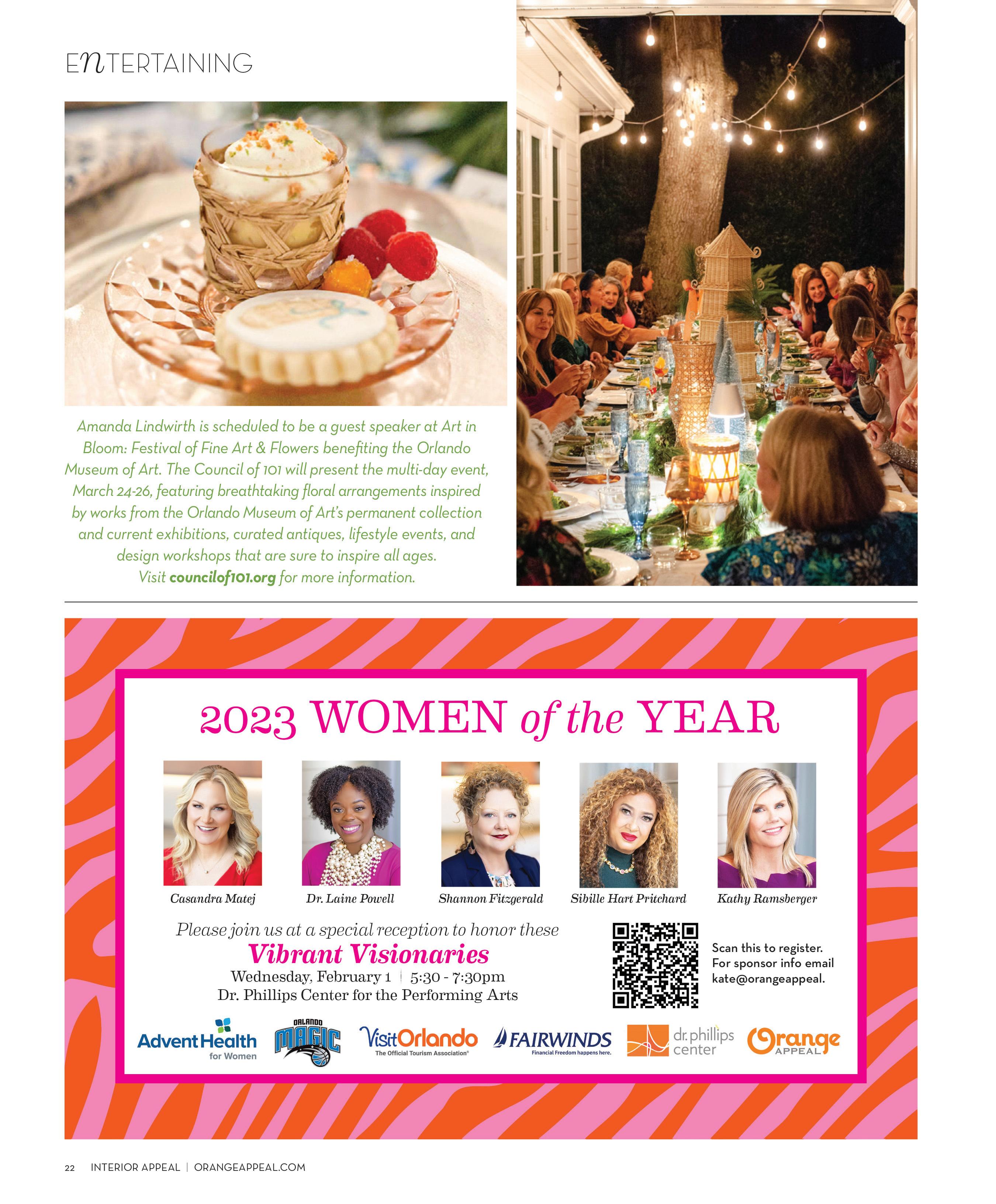 EDITOR & PUBLISHER Christi Ashby christi@orangeappeal.com ASSOCIATE EDITOR & PUBLISHER Kate Slentz kate@orangeappeal.com CIRCULATION CONSULTANT Molly O’Shea BUSINESS MANAGER Robert Ashby ADVERTISING SALES Emily Bienvenu emily@orangeappeal.com PHOTOGRAPHERS Rickie Agapito, AOFotos Abby Liga Photography Seamus Payne PRODUCTION DIRECTOR Rita Tyrrell FOR ADVERTISING: advertising@orangeappeal.com FOR SUBSCRIPTIONS: subscriptions@orangeappeal.com orangeappeal.com Copyright 2023. No materials may be reproduced without permission. Please do not send unsolicited articles or photographs. Publisher not responsible for individual opinions contained herein. Orange Appeal (Permit #201) is published bi-monthly by Appeal Media & Events Group, 1903 Michael Tiago Circle, Maitland, FL 32751. Printed in USA. Standard postage paid at Harrisburg, PA and additional mailing offices. POSTMASTER: Send address changes to Orange Appeal, 1903 Michael Tiago Circle, Maitland, FL 32751 4 INTERIOR APPEAL | ORANGEAPPEAL.COM