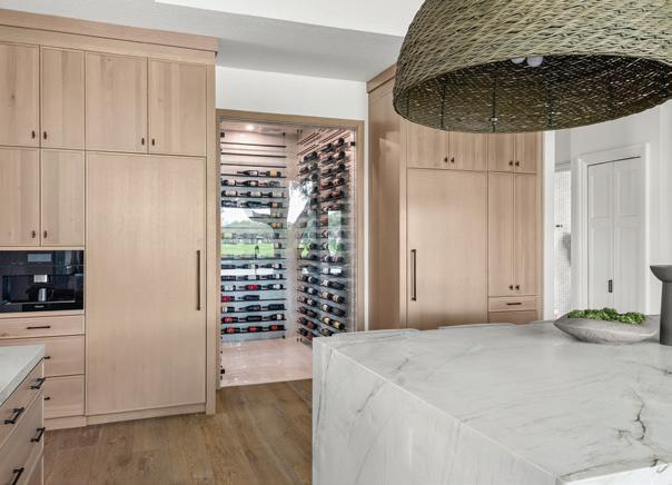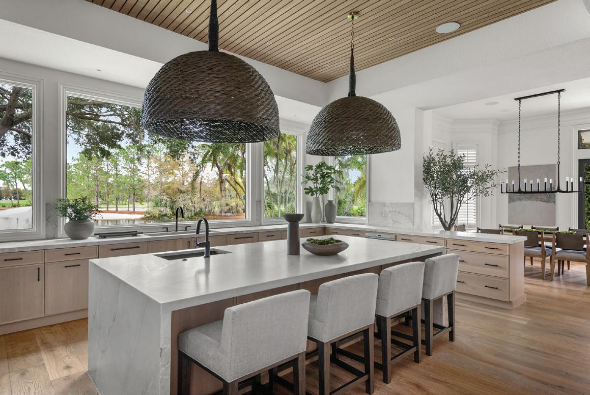Another beautifully functional kitchen by the pool continues the design style from inside with all the amenities including a large counter island, two large TVs and stools and oversize pendants in natural material. Chris credits the cohesive outcome to the team. “If you don’t have a good cabinet designer, you don’t have a good interior designer and you don’t have a good builder, you’re going to spend a lot of time and money getting things right.”