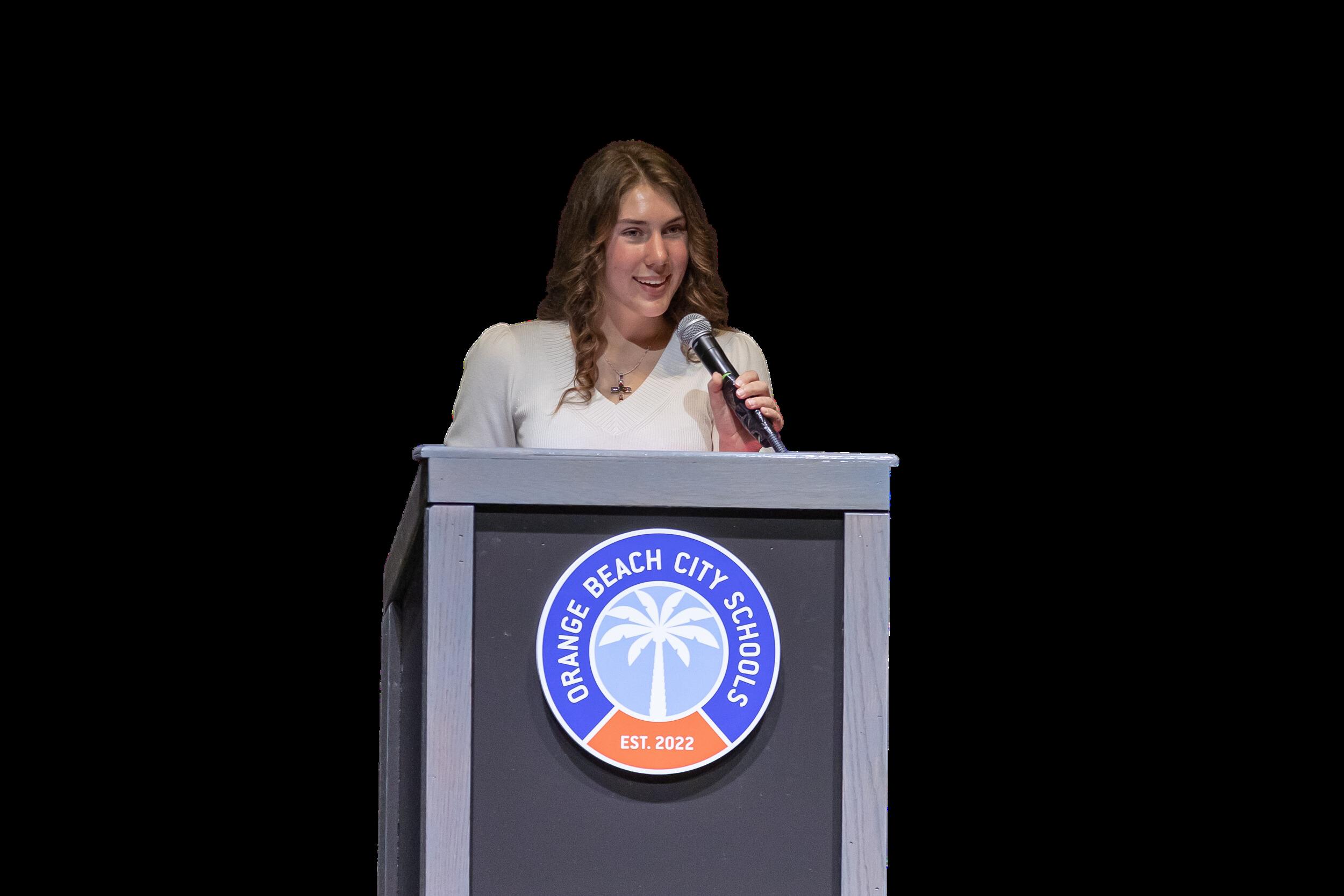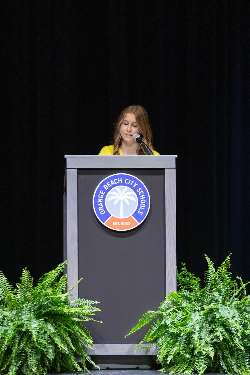At Orange Beach High School, the Senior Class of 2023 chose to preserve a tradition begun by the Class of 2022 to have a student-led Baccalaureate Service. Instead of inviting a speaker, our seniors elected to address or perform for their classmates themselves. Offering words of advice, encouragement, tributes, and farewells, this ceremony is one of the most special graduation events. Seniors personalities shone brightly, as they took to the stage for their fellow graduates and honored guests They spoke about overcoming obstacles together, being the firsts in so many ways, about the fun memories, and the excitement of what is to come. Most importantly, they remembered the relationships formed with each other and with their teachers.