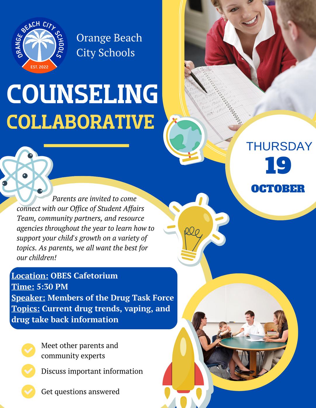 All are welcome to join our Student Affairs Team on Oct. 19th for the Counseling Collaborative. This initiative connects our parents with experts on topics of concern. This month, the Drug Task Force will engage in conversation with our community about the dangers of drugs and vaping. They will provide a wealth of information to bring awareness and assist parents in making educated decisions that can positively impact the lives of their children.