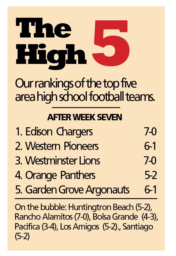 Of course, there’s more at stake than just a cham pionship plaque. Fourteam leagues will get two CIF-SS playoff berths, just as s six-team group ings will get three. As for the rest of the West Orange County area, the “big game” is Edison (7-0, 2-0) hosting Los Alamitos (5-2, 2-0) for the Sunset League title on Thursday. The Char gers are ranked fourth in Orange County and the