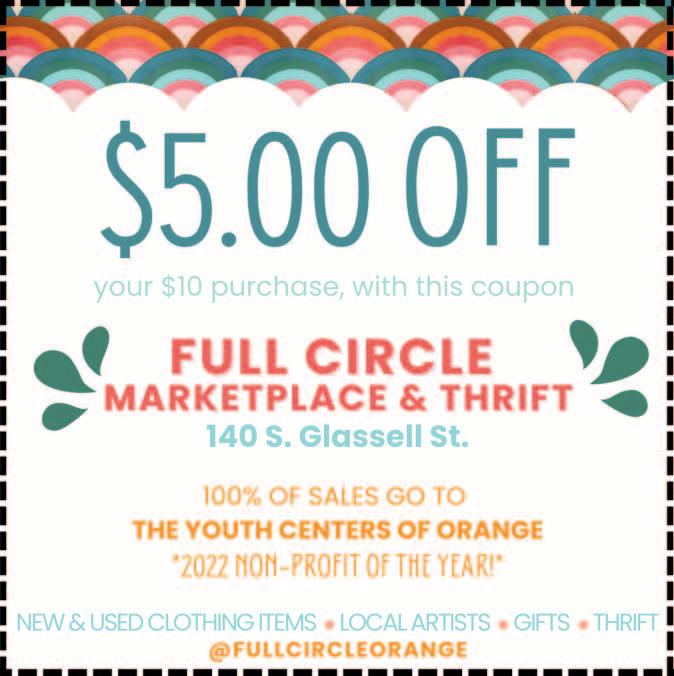 All Types of Roofs & Repairs C OMMERCIAL & R ESIDENTIAL License #663983 31 Years in Orange, Serving Southern California Roof Leak & Re-Felt Specialists. 714- 244-6567 www. GallaRiniRoofing .com Comprehensive Eye Care Husband & Wife: Dr. Alex Romero & Dr. Ly Nguyen 227 East Chapman Ave #C Old Towne Orange, CA 92866 / 714- 53 8- 6424 Celebrating 10 Years in oT o ! “News for the Neighborhood” May June 2023 Orange’s #1 Home Seller OrangeRealty .com OldTowneOrange .com 71 4 - 9 9 7- 005 0 x 101 Resident Old Towne Specialist Since 1949 264 North Glassell St. 714-633-3260 Available for Private Events “Celebrating 16 Years in Old Towne” 260 North Glassell St. Wed-Fri: 1 1 - 5 / Sat: 9 - 5 / Sun: 1 1 - 4 Tel: 714- 289-4689 Explore Your Creativity at our New Workshops! Register on-line at: dragonflyshopsandgardens .com “ To be or not to be a Vegetarian ” A Healthy Alternative to Traditional Restaurant Offerings. Mon - Wed: 10:30 am - 5 pm Thu - Sat: 10:30 am - 8 pm